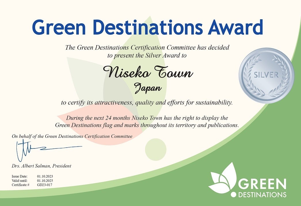 ニセコ町は、観光地の国際認証団体 「グリーン・デスティネーションズ」(本部オランダ、以下GD)の審査を受け、シルバーアワードを受賞いたしました。※1