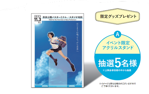 イベントは、文化の日に合わせて、芸術と歴史をテーマにスタジオ地図のフィロソフィー「子どもと若者の成長と変化を称え 未来を選択する力を創造する」に賛同し、奈良や日本の将来を担う子どもたちと一緒に映画や演奏といった芸術や、未来を描くワークショップを開催することにいたしました。