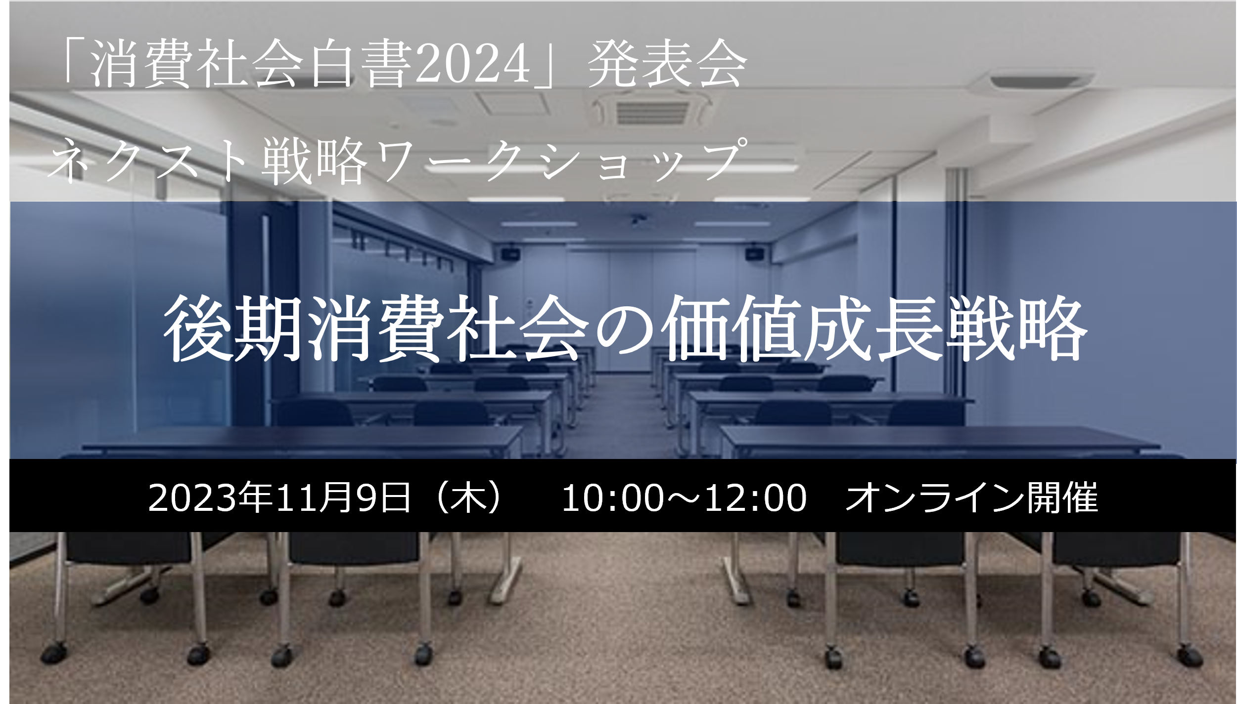 いまの時代をどう捉え、市場をどう読むか、どんな戦略展開が必要か、時代の半歩先を読む消費社会白書2024のエッセンスをいちはやくお届けするネクスト戦略ワークショップを11月9日に開催することになりましたのでご案内いたします。多くの方にご視聴いただくために、今年もオンラインでの開催とさせていただきました。