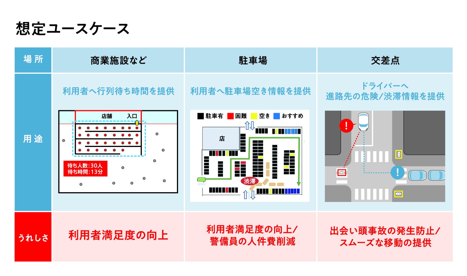 また、検知した情報を蓄積・分析し、人やクルマの動きの予測を可能にします。交通事故の防止や渋滞緩和など、さまざまなシーンへの活用が可能になり、移動における利便性だけでなく、安全・安心を実現します。