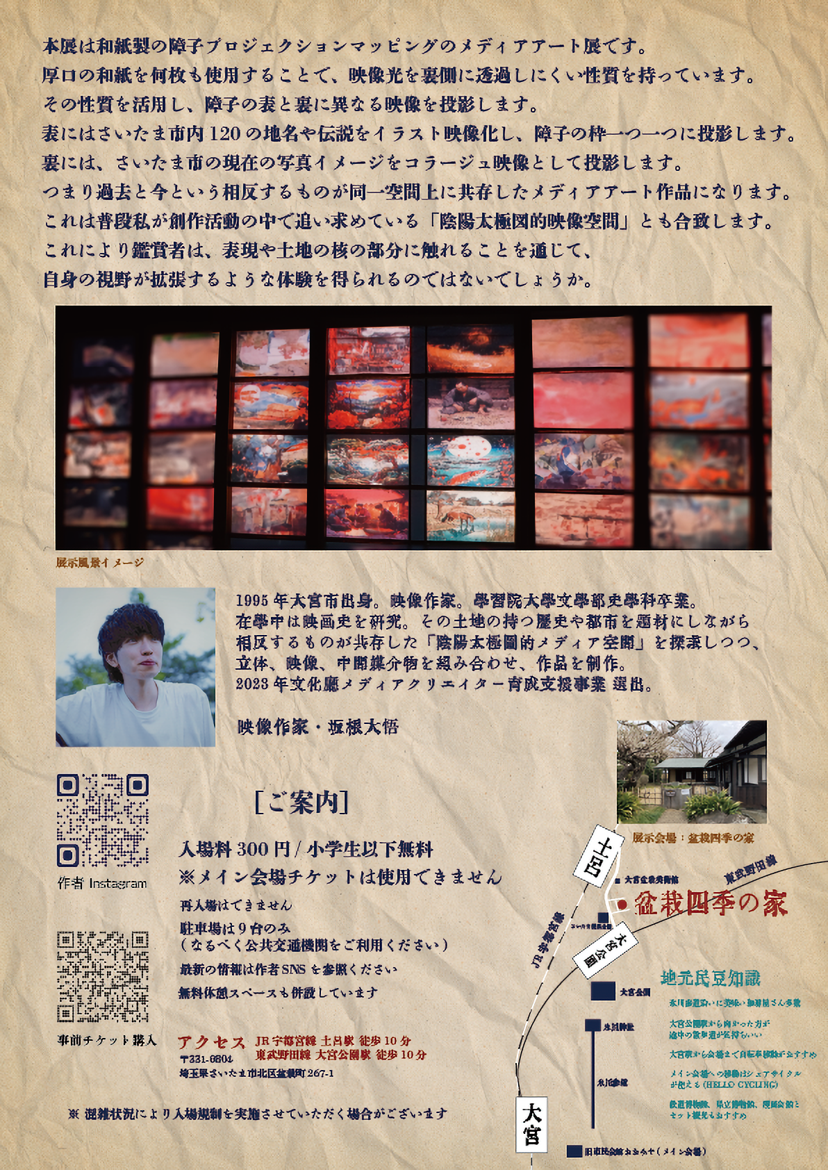 表には、さいたま市内の120の地名と伝説をイラスト映像化し、障子の枠一つ一つにそれぞれ異なる映像を投影します。裏には、さいたま市の現在の風景をコラージュ化した映像を投影します。