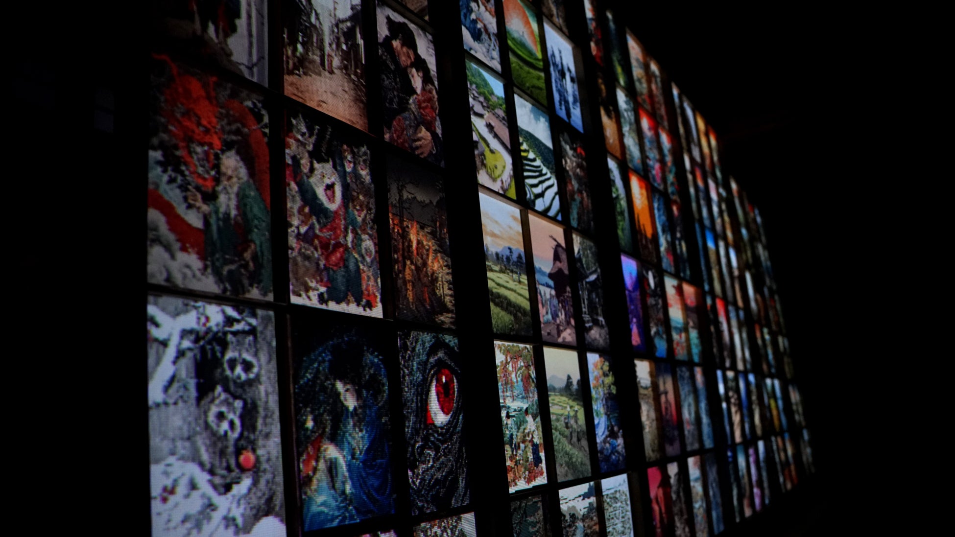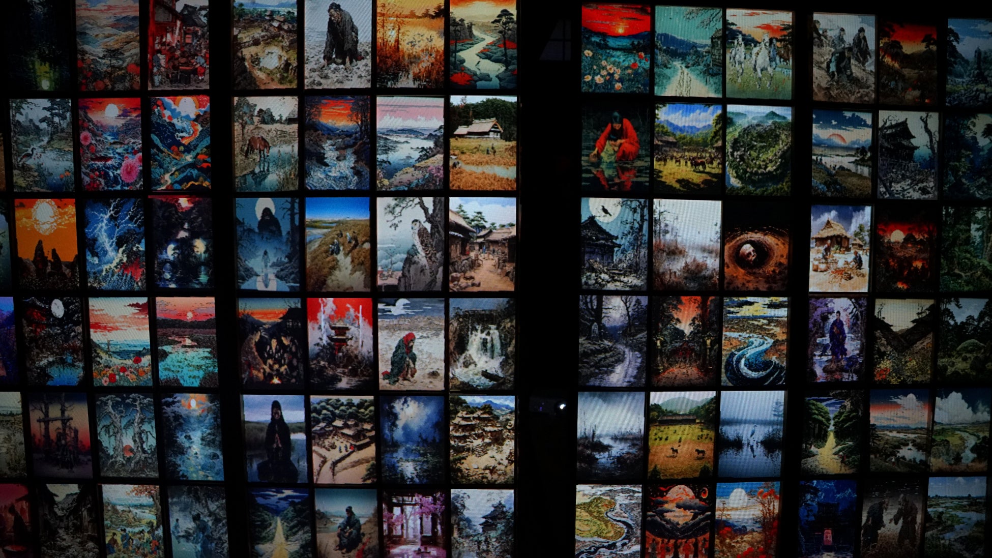 「埼玉県地名誌 名義の研究」や「日本歴史地名大系11 埼玉県の地名」や合併前の市史を元に120の地名や伝説に基づいた画像を画像生成AIで3000枚以上作成し、そこから120枚抽出しました。それらを動画化し、1マスごとに実際の地名の位置に基づいてマッピングしています。今では失われてしまった古い土地の様子が地名から垣間見えます。