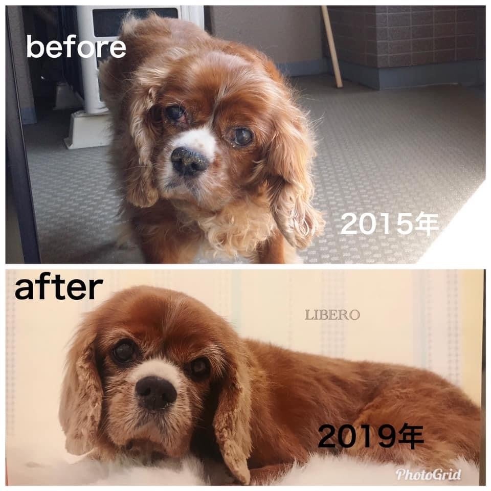 8歳までペットフードで育てていたキャバリアの信太郎は持病が悪化し幼少期から薬が欠かせない生活を送っていましたが、手作りごはんに変えてから見た目も目の輝きも毛艶も変わりました。