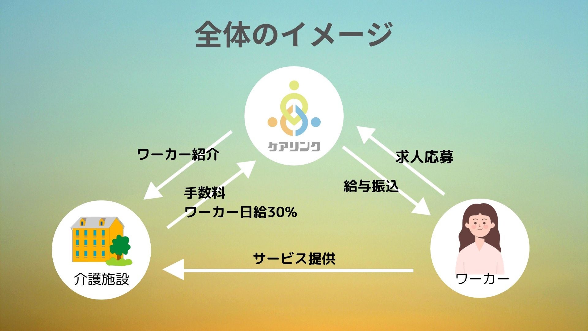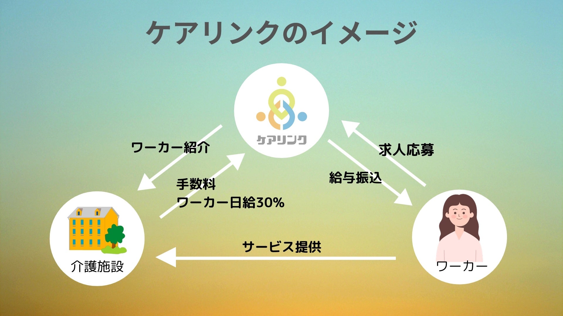 人手不足の介護施設と働きたい人双方の希望をマッチング。介護施設は初期費用・月額費用無料で、手数料はワーカーの働いた日給の30%のみ!ワーカーは全ての機能を無料で使えて、働いた分のお金がすぐもらえます。