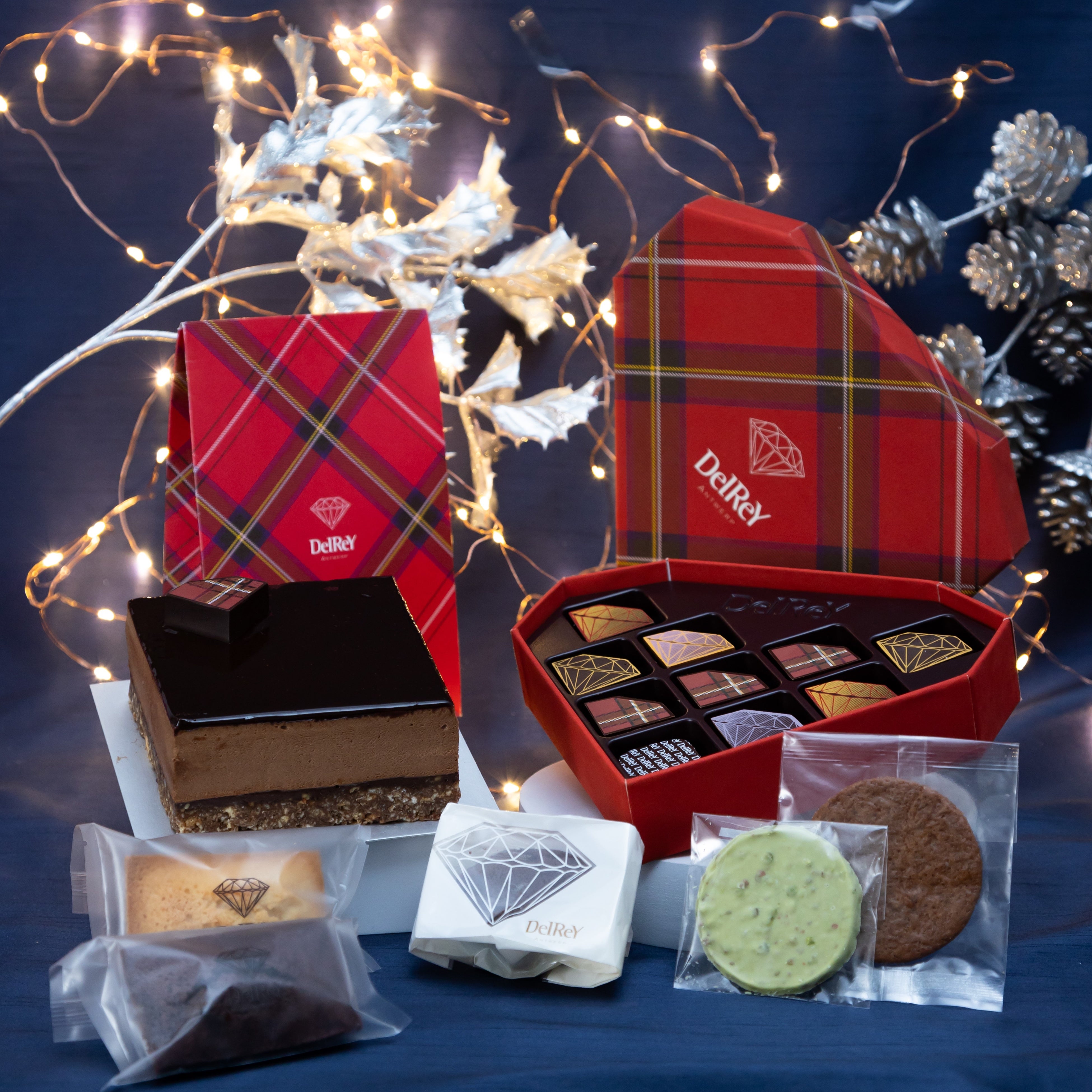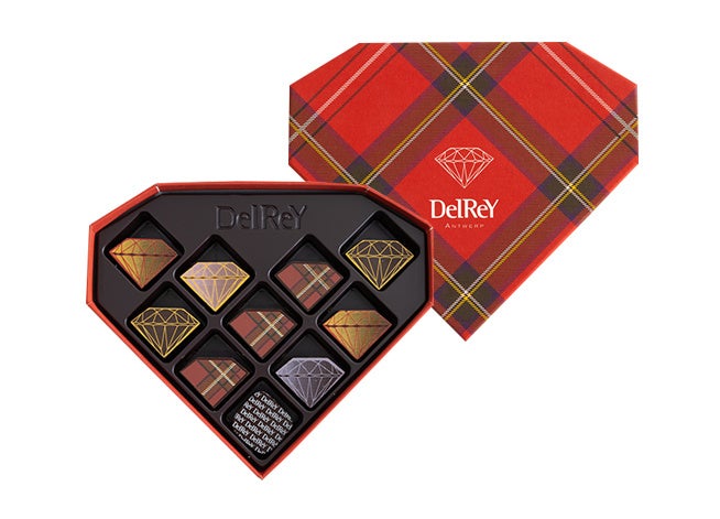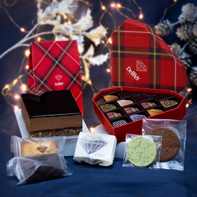デルレイを代表するダイヤモンドBOXに、赤のタータンチェックをモチーフに、ダイヤモンドショコラやスクエア型ショコラなどを10個詰め合わせました。内3個は、BOXとおそろいの赤のタータンチェック柄のダイヤモンドショコラ、こちらのフレーバーは、クリスマスケーキと同じくアップル&シナモンのガナッシュですが、BOXとおそろいの赤のタータンチェック柄で表現しました。他、2023 Chocolate Collectionより、キャラメルやカカオ、ラズベリーなど、様々なフレーバーをおさめました。