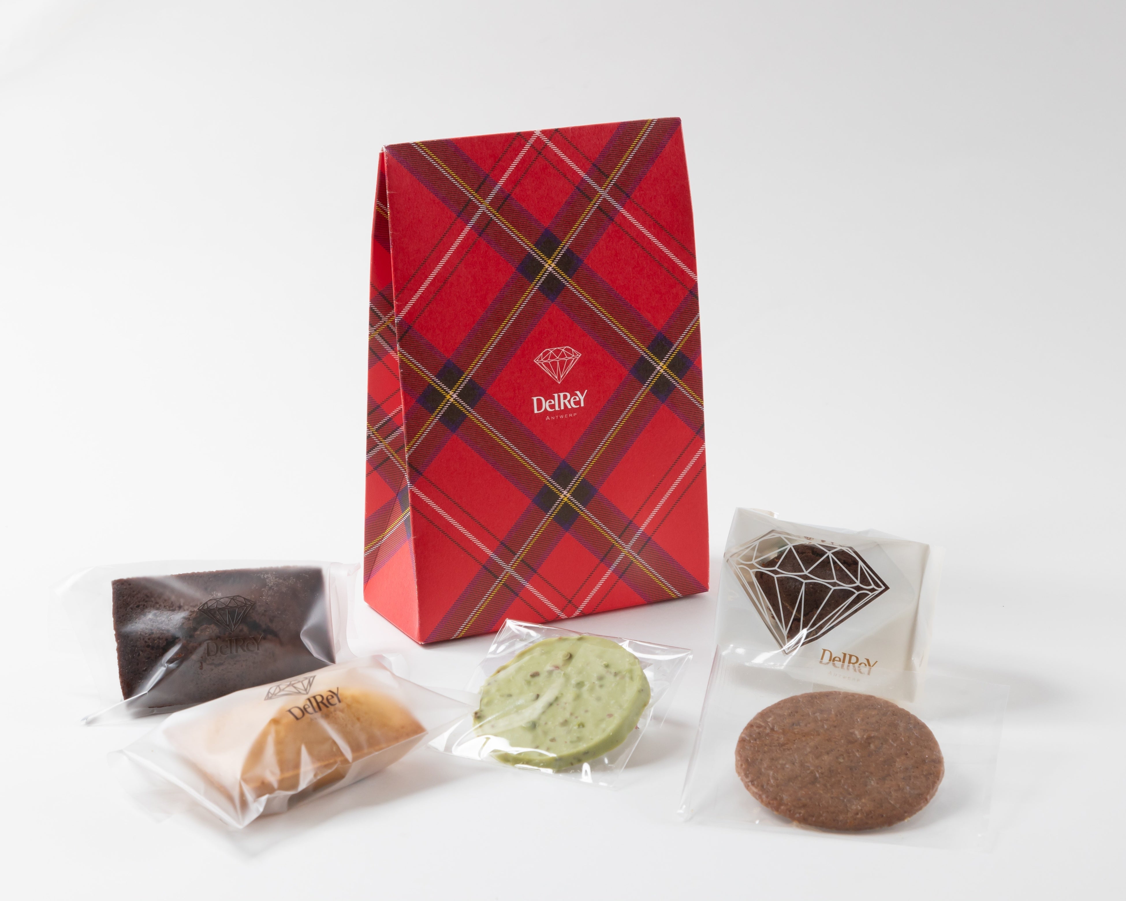 ダイヤモンドBOXと同じ赤チェック柄の組箱に、デルレイの人気の焼き菓子をアソートにしました。