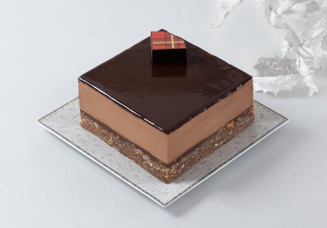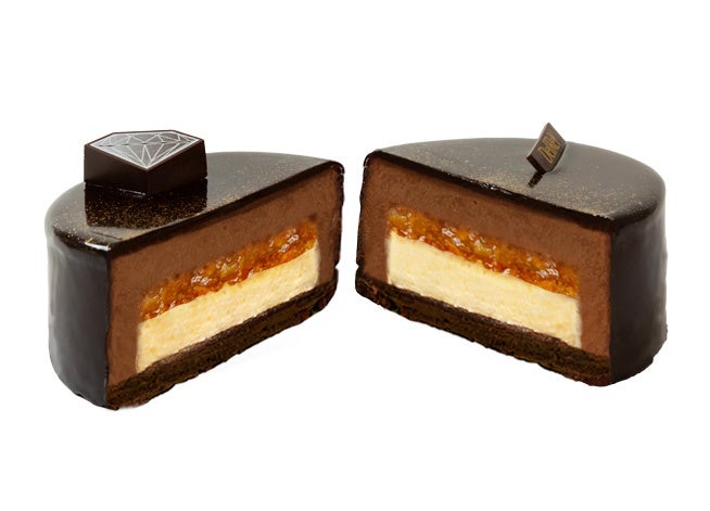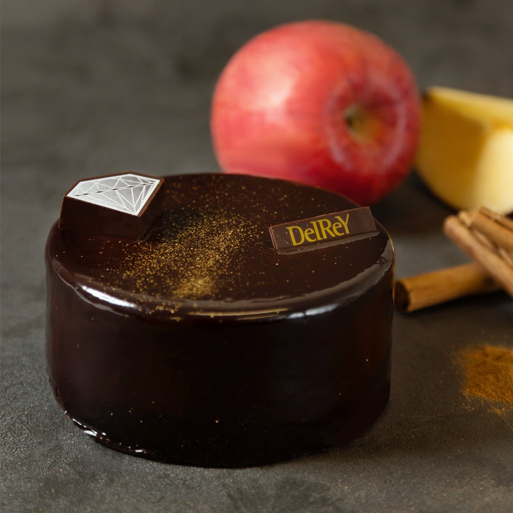 ピーカンナッツキャラメルを重ね、軽めのチョコレートムースをのせ、グラサージュをかけました。トップには、アップルシナモンガナッシュのダイヤモンドショコラをトッピング。