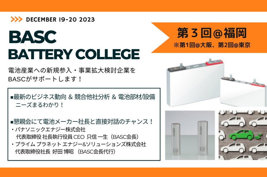 【12月19日・20日開催】パナソニックエナジー、住友金属鉱山、プライムプラネット登壇「バッテリー産業セミナー(BASC Battery College)@博多」を開催