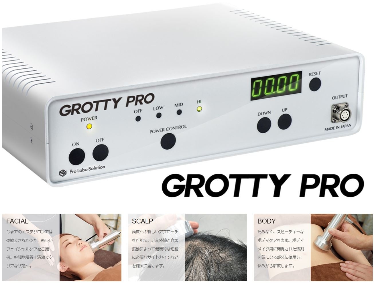 美容業界注目の最新美容機器をGROTTY PRO(グロッティプロ)を地域初導入!音響振動と近赤外光(線)を一緒に照射することで、血液の中にある一酸化窒素を増やしてくれます。※当日は衣服を着たまま体験いただけます
