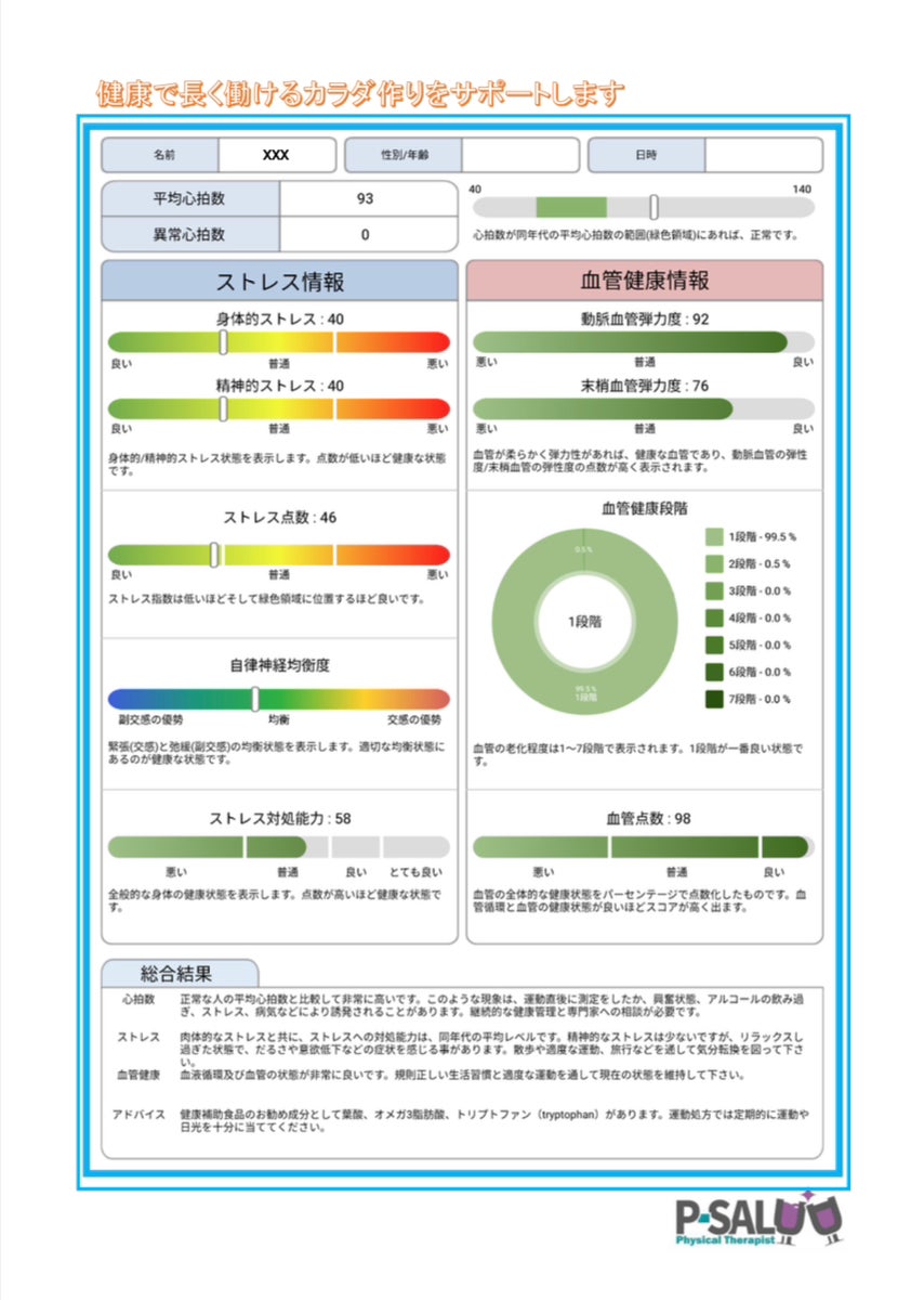 たった数分で血管の健康状態や現在のストレス状態をチェック!下記画像の形で診断結果が表示され、血管点数が分かります!