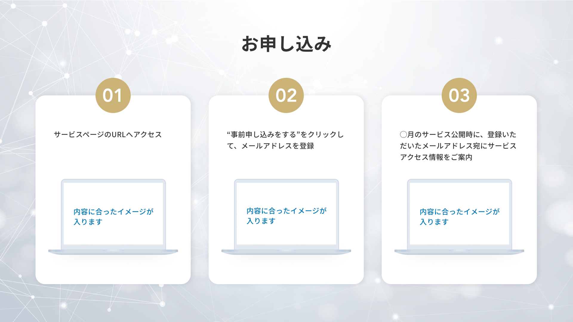 ※初回リリース時に、事前申し込みいただいた方の中から抽選で100名の方へ、メールにてサービスの先行案内をさせていただきます。