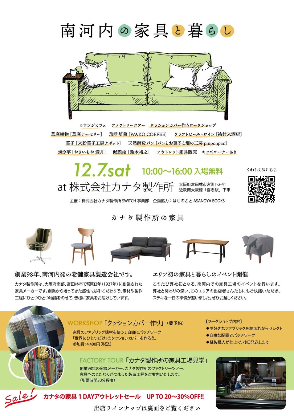 12月7日(土)、大阪府富田林市にある創業98年の老舗家具メーカー「カナタ製作所」にて、「南河内の家具と暮らし」が開催されます。歴史ある家具工場の敷地を舞台に、南河内の出展社が集結。美味しいコーヒーや焼き芋、クラフトビール、こだわりのパンなど、地元の味覚を堪能できます。