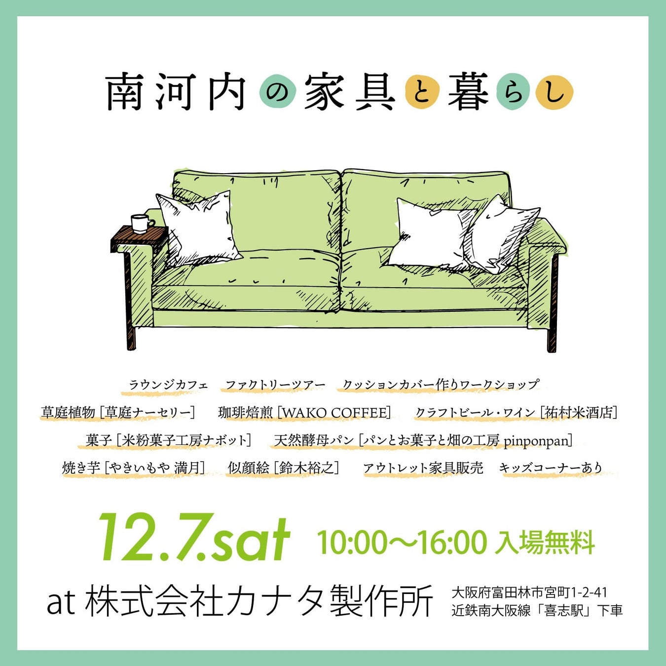 12月7日(土)、大阪府富田林市のカナタ製作所で、美味しいもの、素敵なもの、インテリア、ワークショップ、アウトレット製品が盛りだくさん!