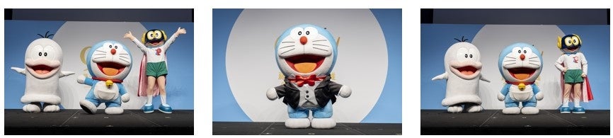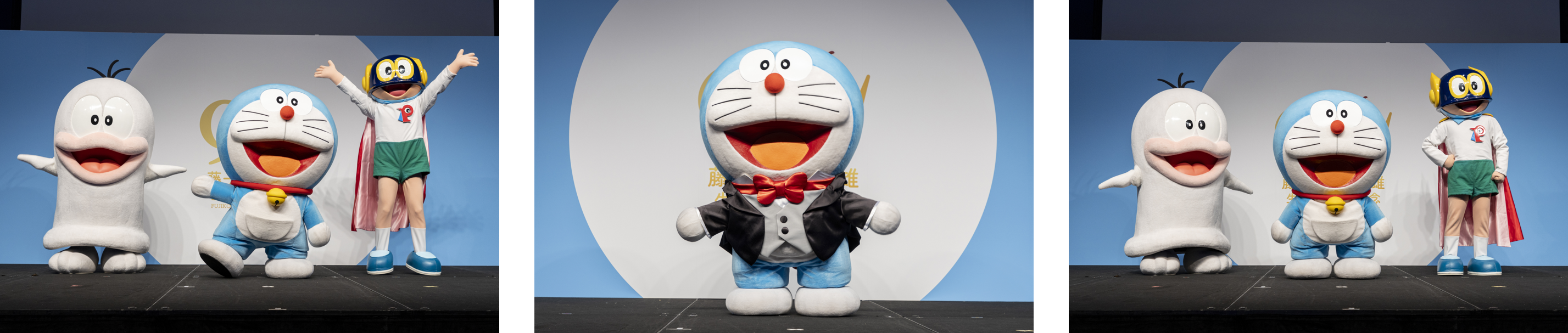 90周年を記念する本発表会の開会宣言では、藤子・F・不二雄先生が生んだ人気キャラクターの「ドラえもん」、「パーマン」、「オバケのQ太郎」が登場しました。会の始まりでは、『藤子・F・不二雄 生誕90周年 企画発表会』の開催を宣言するドラえもんの掛け声からスタート。また、ドラえもんの掛け声に続き、パーマンとQ太郎も大きな拍手で盛り上げて、発表会の開会を飾りました。