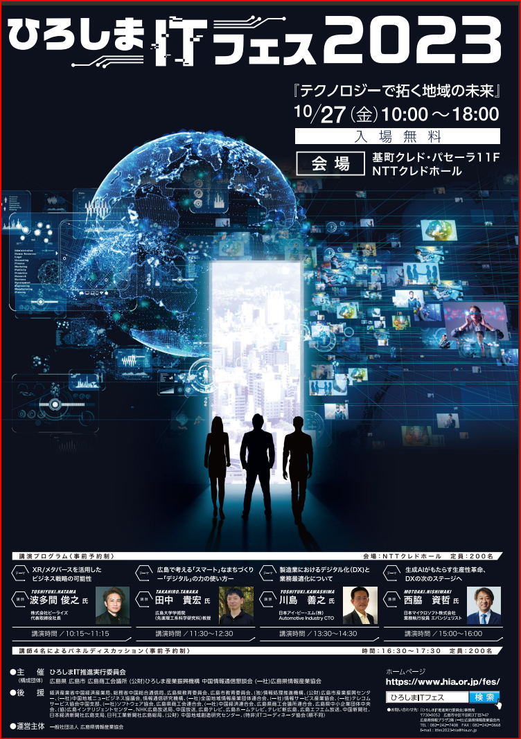 この大きな変化を受けて、従来の開催の在り方を見直すこととし、来場者の皆様に、デジタルテクノロジーの活用が、地域社会や企業の未来をどのように切り拓くのかを考え、想像し、体感して頂くことをテーマとして、「ひろしまITフェス2023 ~テクノロジーで拓く地域の未来~」を開催します。