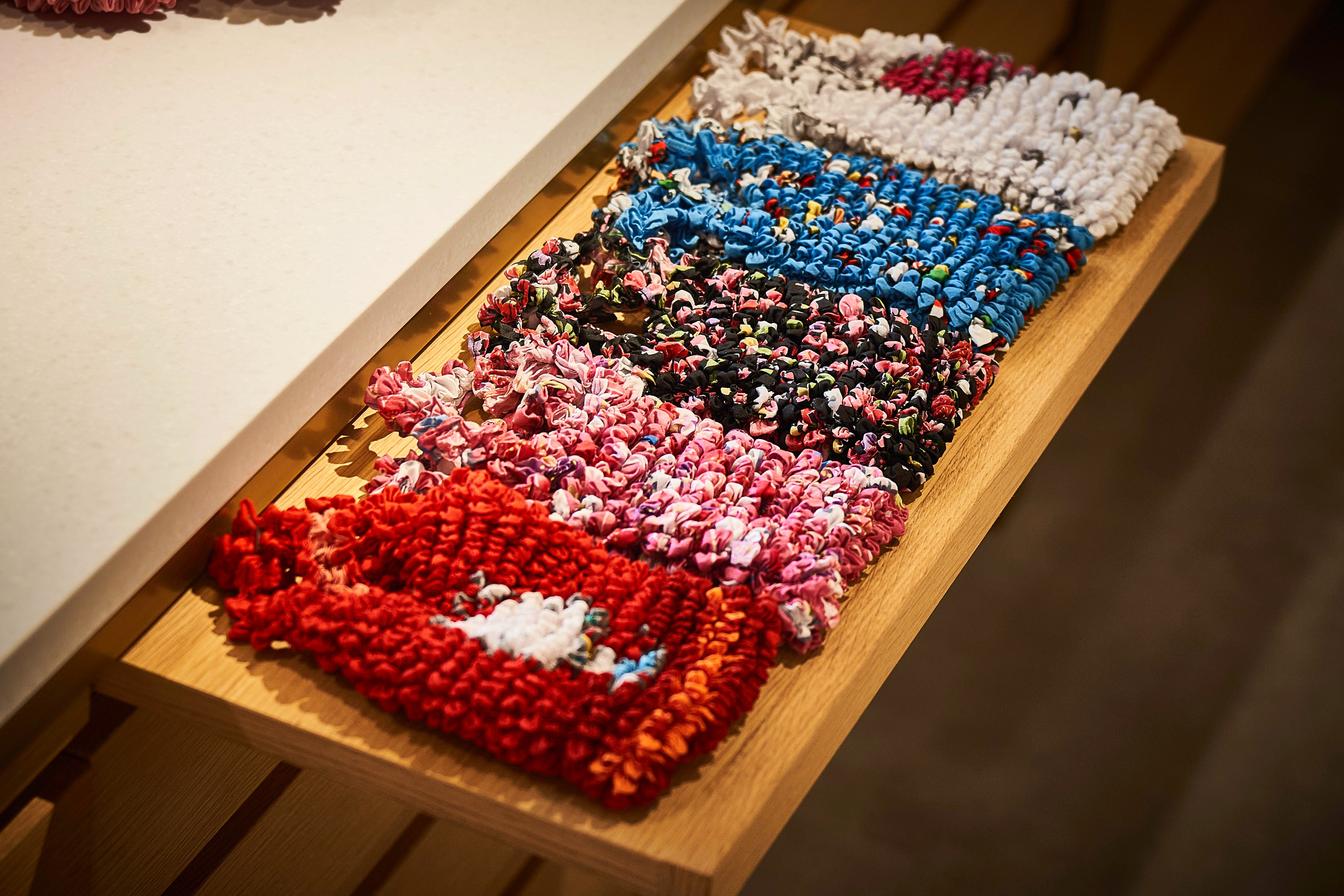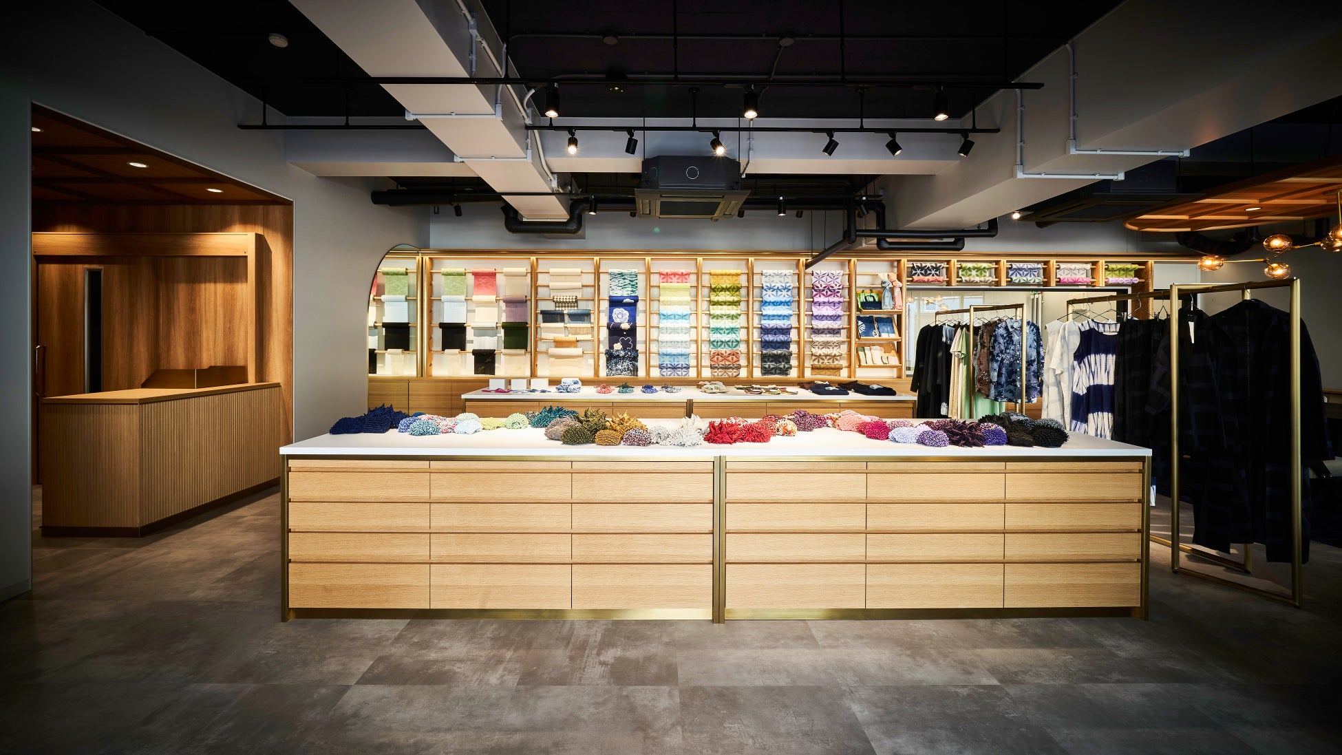 The Hands-On Experience Concept Shop has a space where business discussions and workshops can be held. In this space, we have adopted a ceiling and table based on the image of a cocoon. In addition, we have prepared materials such as publications related to tie-dyed fabrics, dyeing, culture, and manufacturing. We have aimed to create an environment in which ideas can easily come to mind when visitors come to the shop and see the many products with their own eyes, hold them, directly feel the colors and textures, and wonder what can be made. Through idea generation and research with designers and creators, and workshops with students and everyday people, we aim for this space to become an installation lab for tie-dyeing and dyeing in which new exchanges between techniques, people and ideas can be born.