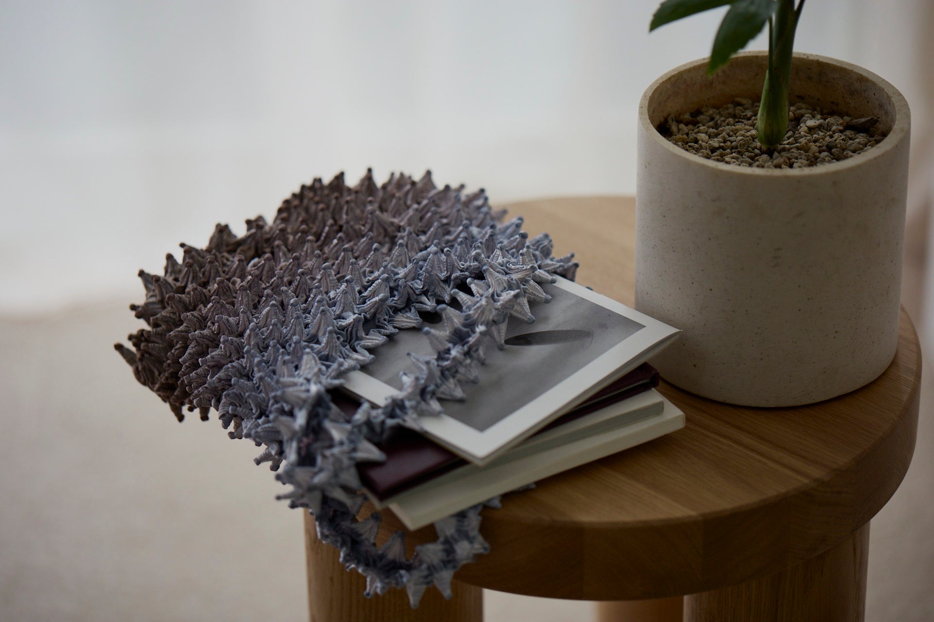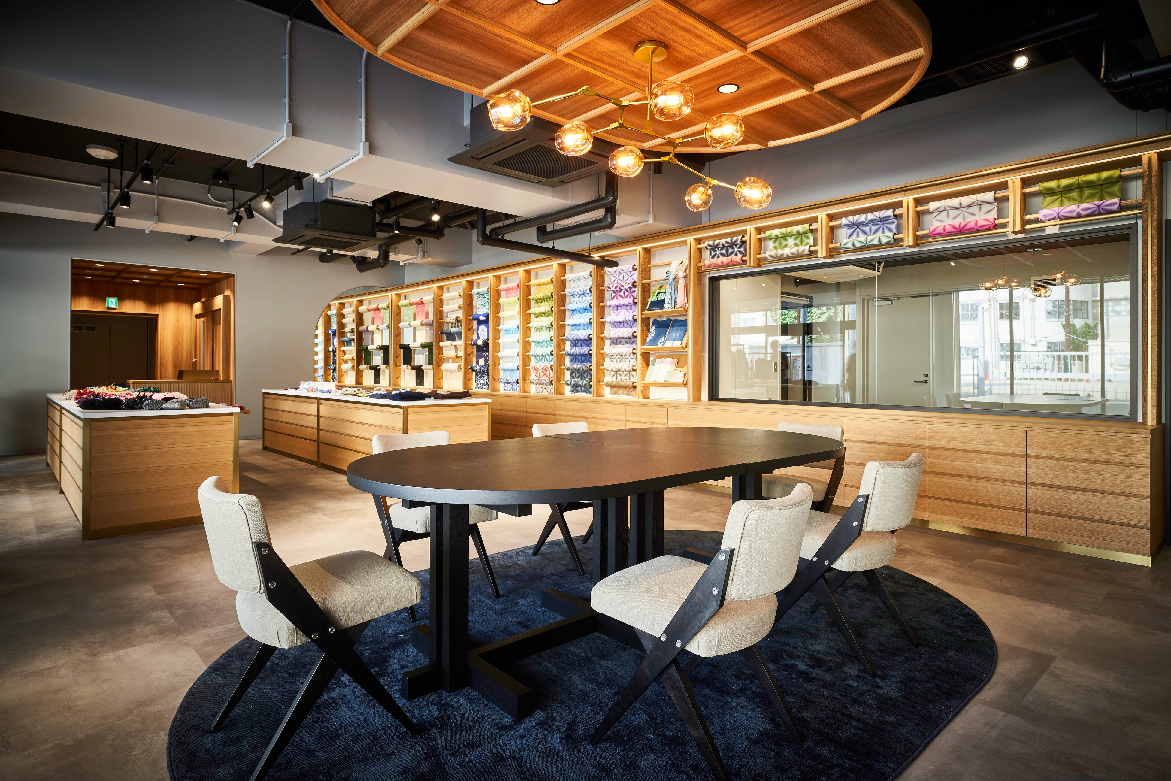 体験型コンセプトショップ内の商談/ワークショップを実施するスペースには、繭をイメージしたデザインの天井とテーブルを採用しました。また、絞りや染色、文化やものづくりにまつわる書籍などの資料もご用意しています。ショップ内のたくさんの商品を目で見て、手に取って、色みや風合いに直接ふれて、これからどんなものを作ろうか、と考えていただく際に、アイディアが生まれやすい環境をめざしました。デザイナーやクリエイターの方とのアイディエーションや研究、学生や一般の方とのワークショップを通じて、技術や人、アイディアの交流が生まれるような、絞りと染めのインスピレーションラボとなることを目指しています。