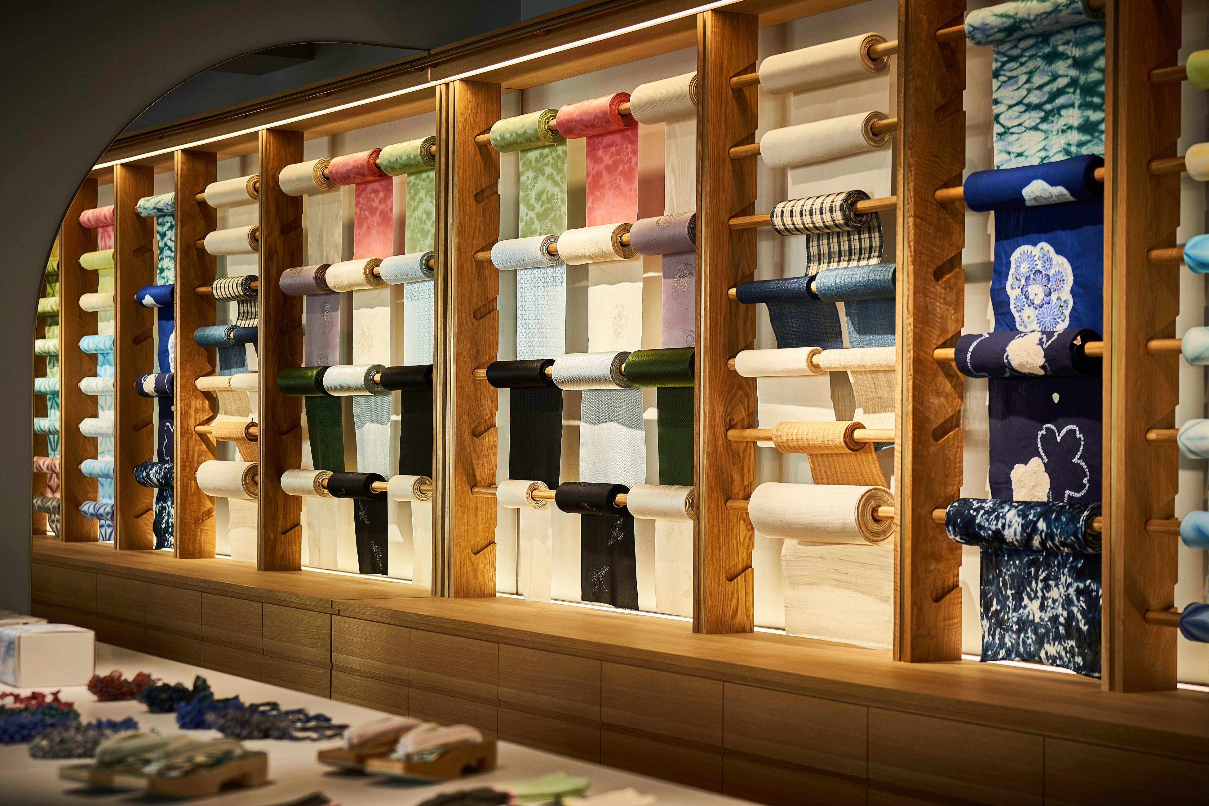 <ANDO>, the Hands-On Experience Shop is not a place that merely displays products. We have aimed to show eye-catching, overwhelming displays as a space that can provide visitors with fresh surprises and feelings. On the wall in front of the entrance, you can see a wall-mounted display that utilizes rolls of tanmono cloth. We have adopted a kind of display that lets visitors enjoy the techniques and thoughts of ANDO as an installed display.