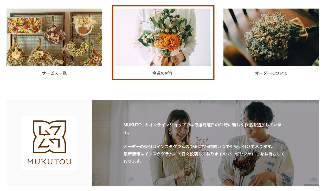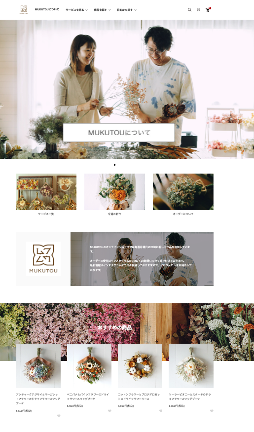MUKUTOUは、2021年にオープンした夫婦で運営しているドライフラワー専門店です。ウェディング用のドライフラワーのオーダーメイドや、ギフト・インテリアとしてのドライフラワーをネット販売し、全国にお届けしています。埼玉県さいたま市浦和区にあるアトリエで、生花からドライフラワーを制作。現在、Instagramのフォロワー数は2万人を超え(2023年時点)、店舗を持たないネット販売のみにも関わらず年間200件以上のオーダーメイド受注でのドライフラワー販売をしています。