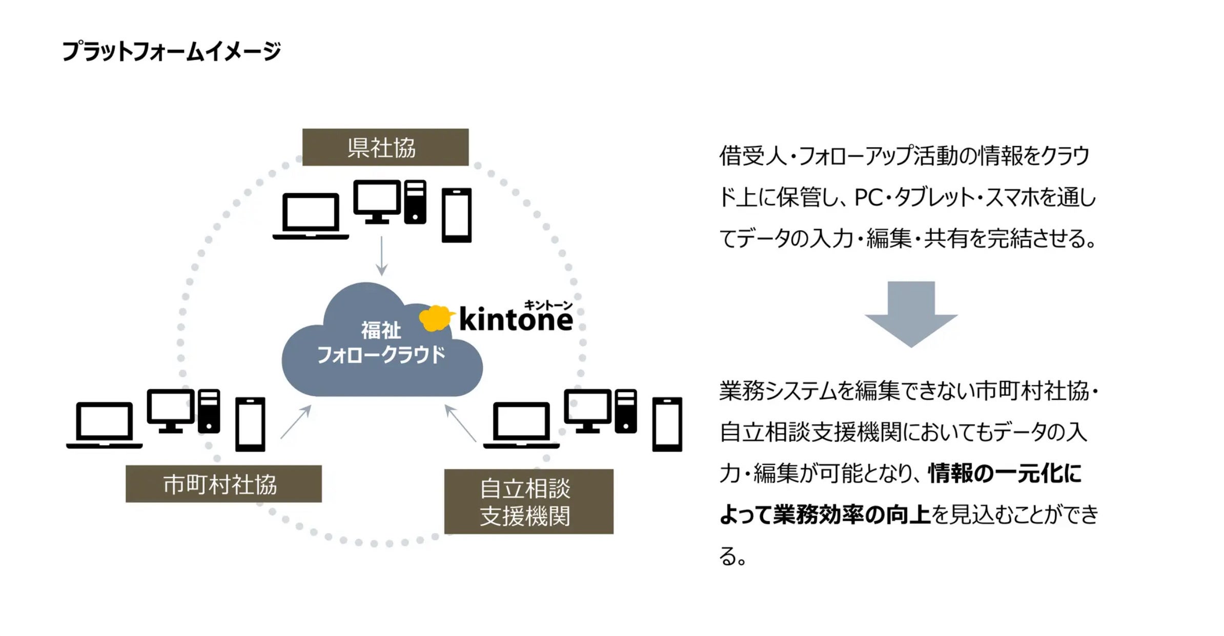 当ツールは、特例貸付の借受人に対するフォローアップ作業を効率化し、その進捗を一元管理できるクラウドサービス(サイボウズ社のkintoneをベースに開発)です。特定の誰かではなく職員全員が借受人の生活のお困りごとやフォローアップ状況などをリアルタイムで確認できるため、借受人へのサポートがスムーズに、かつ効果的に行えます。