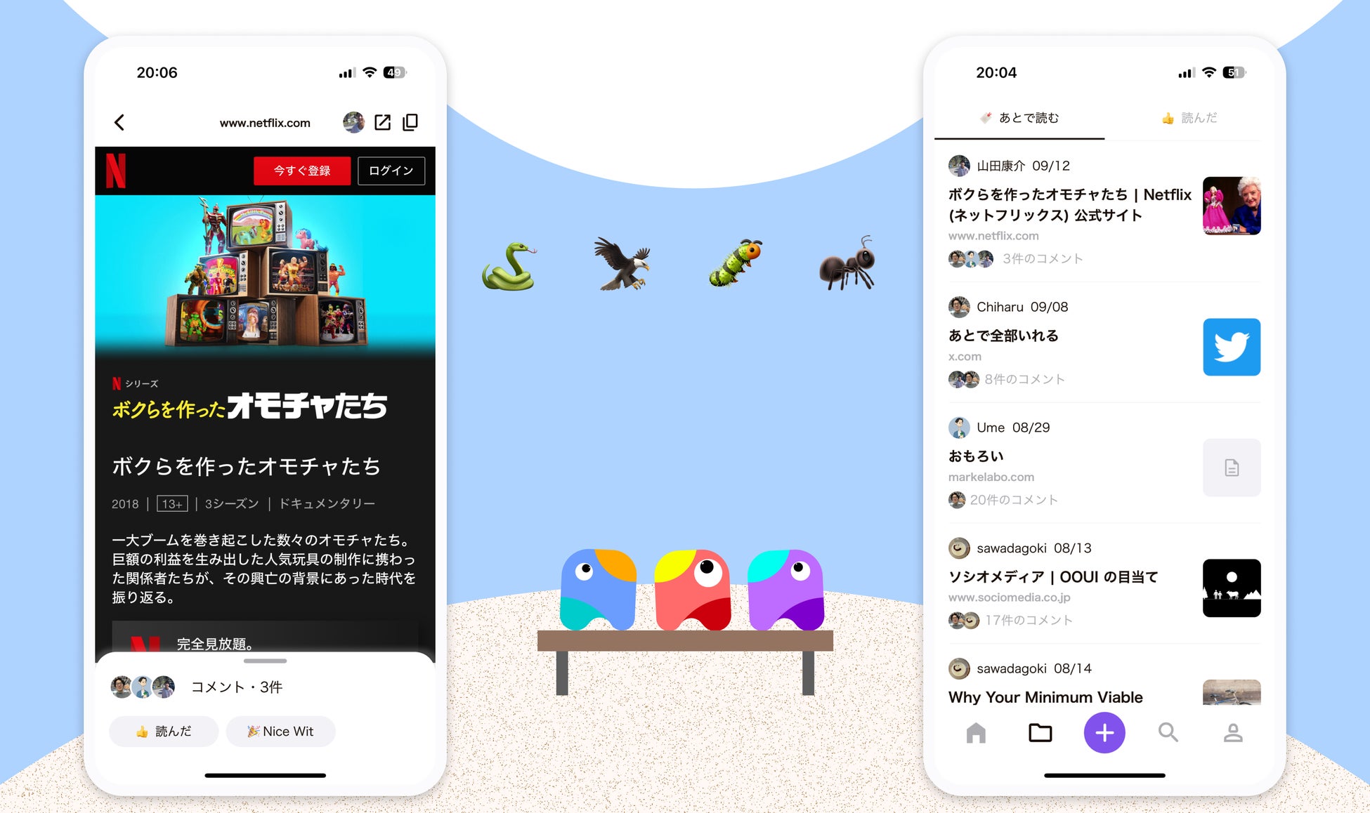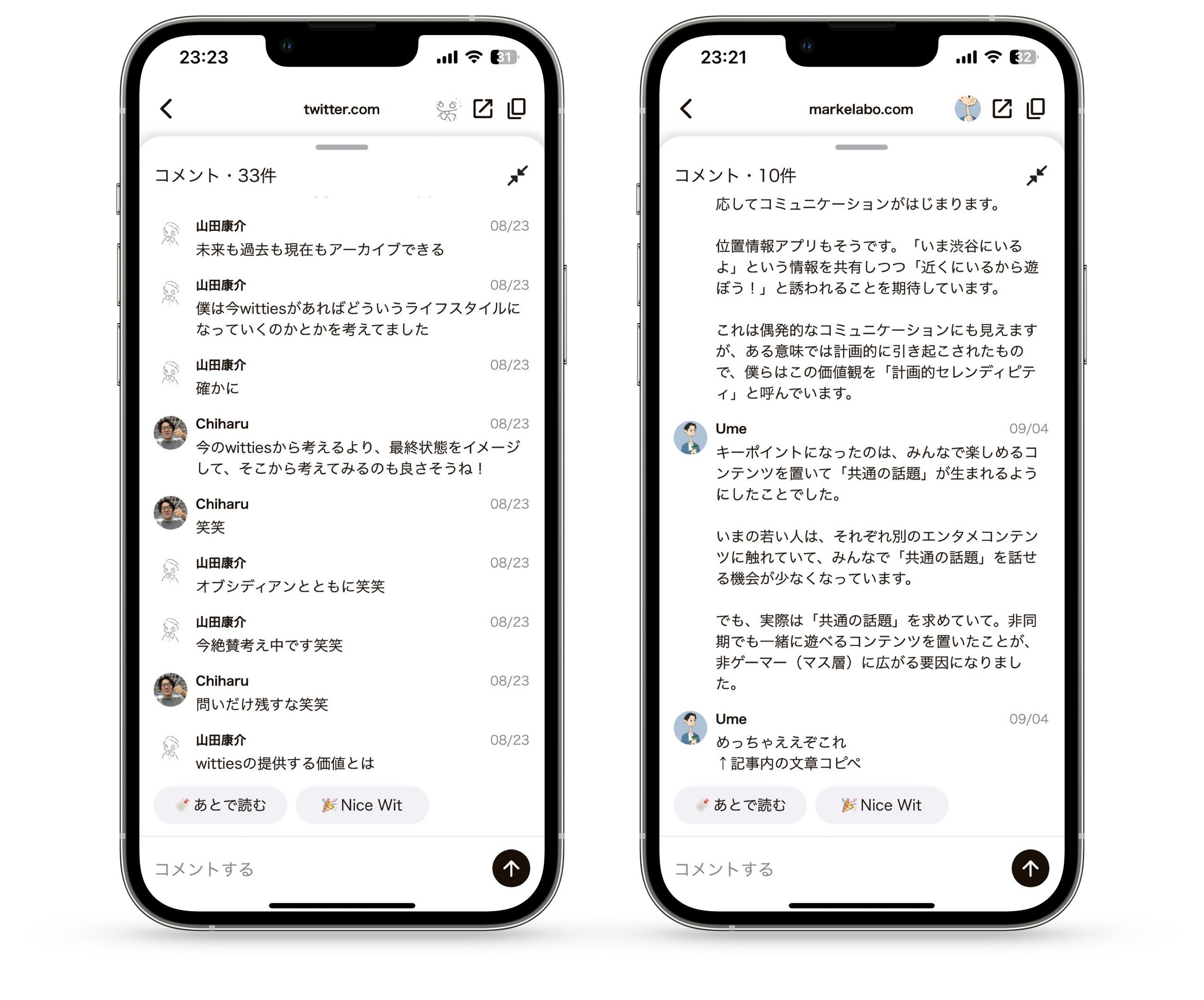 wittiesはただのブックマークアプリやSNS、ニュースアプリ、メモ、ドキュメントとは異なります。 wittiesは「インプットジャーナル」です。私たちの日常の興味や夢、挑戦を仲間と深く共有するための場所であり、「60歳になっても仲間と繋がり笑っていられる」そんな世界線を創ることを目標にしています。現在提供できている機能はグループでのwebページの保存とコメントのみになります。今後も一緒に頑張りたい仲間のあらゆるインプットが記録され、ずっと繋がり続けることができるツールを目指してアップデートを続けていきます。