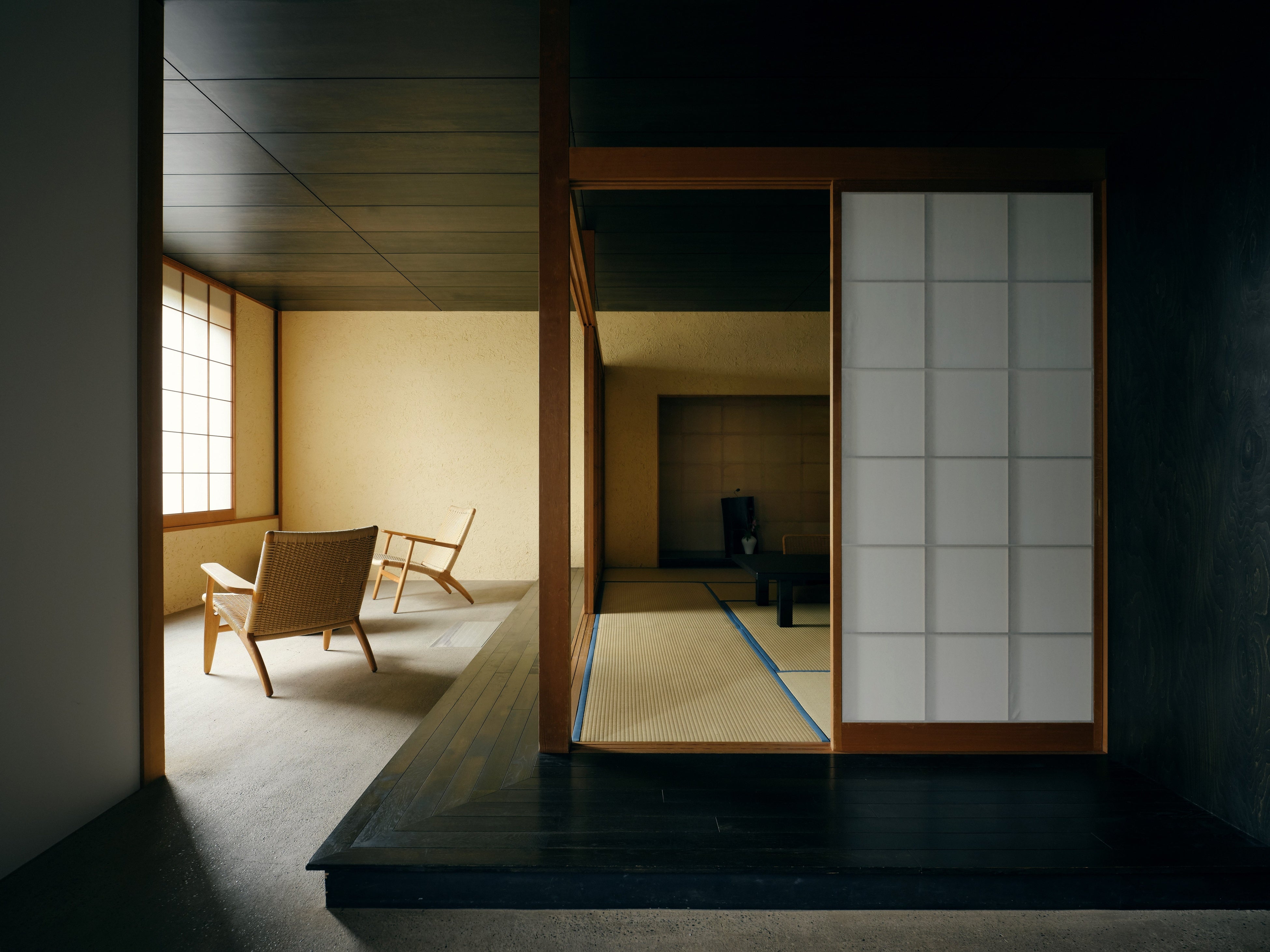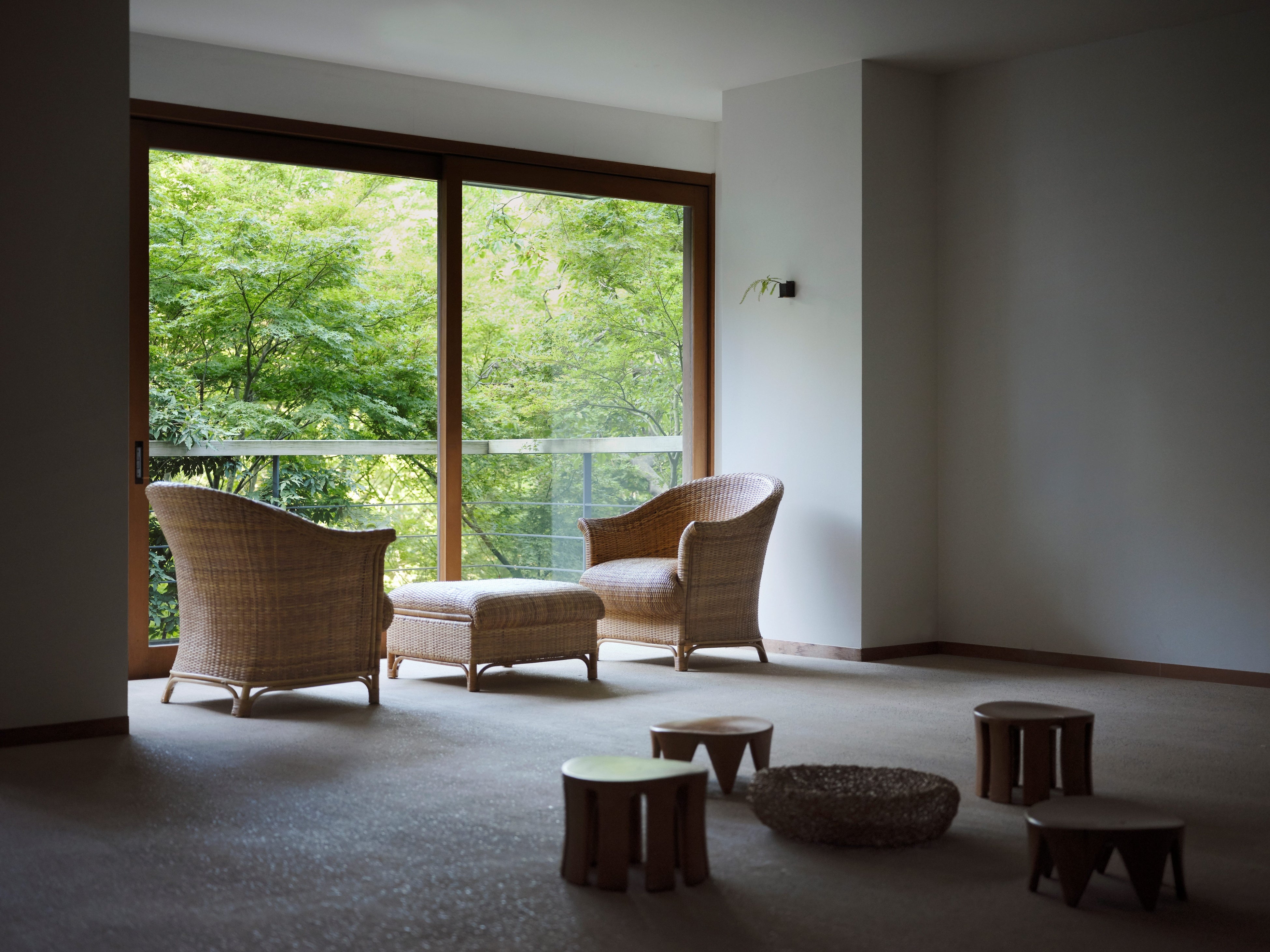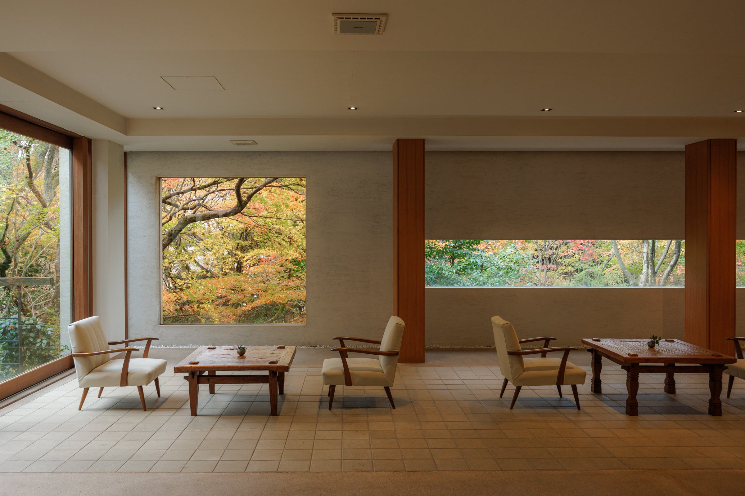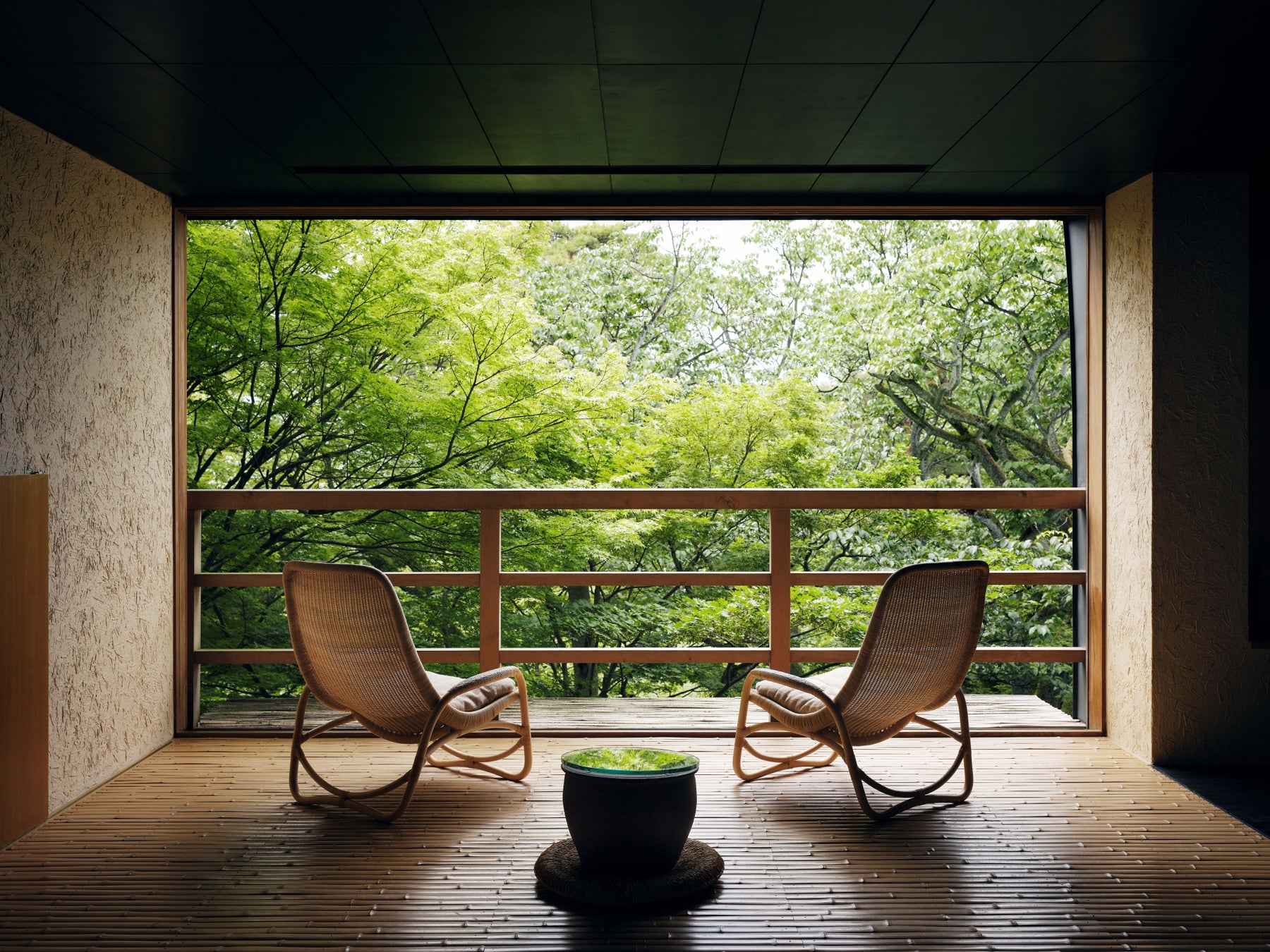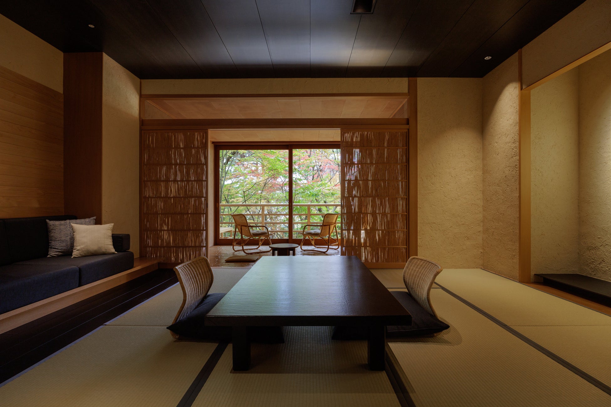 全ての客室は山庭に面しています。客室内は、畳敷きの本間、竹敷の広縁、檜の月見台、柿渋染めの手すき和紙、珪藻土の土壁など、異なる空間や素材を幾重にも介在させながら、いずれの部屋も山庭に向かって水平方向に奥行きを感じさせる落ち着いた和のたたずまいとなっています。