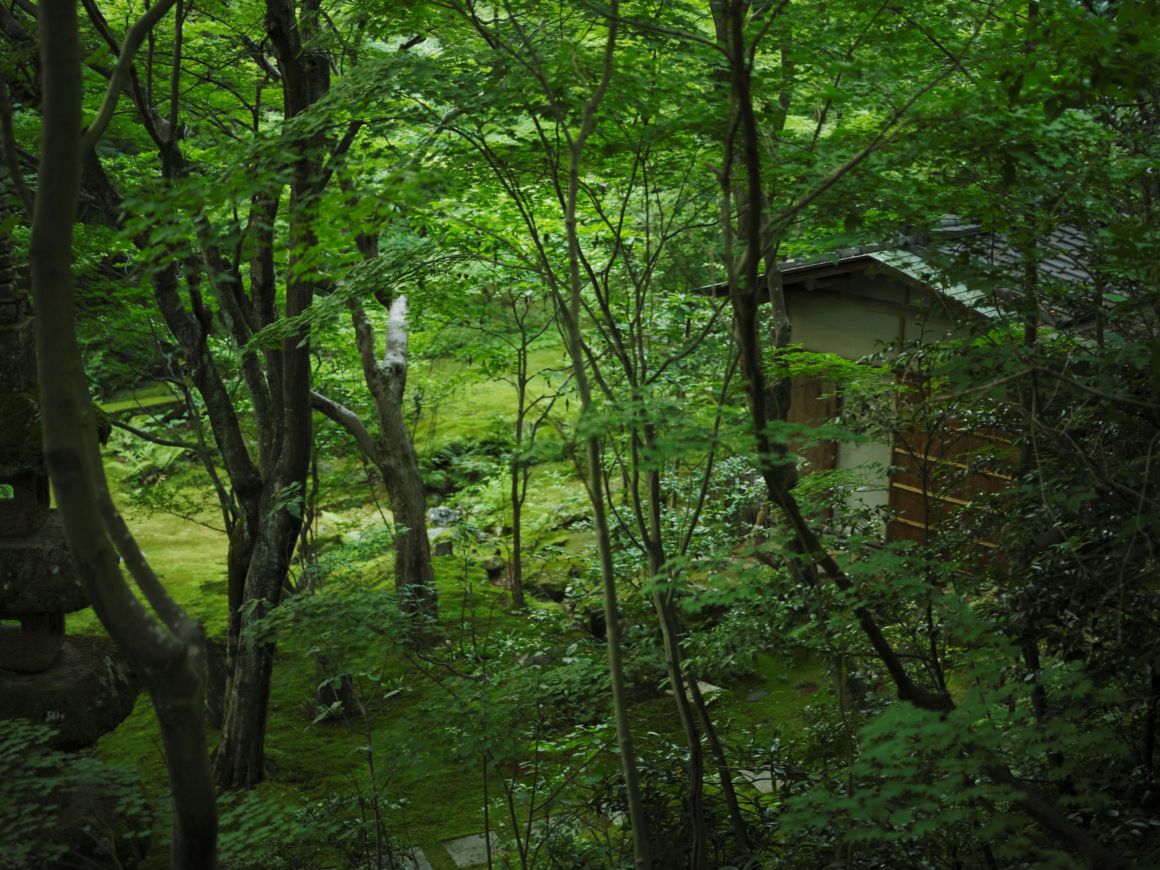 山庭の樹木や苔を間近に眺められるライブラリーです。 樹齢数百年の樹木が生い茂る歴史ある山庭を守り、次世代に引き継いでいくために、このライブラリーは創られました。山庭の豊かな自然に暖かく包まれる安らぎの時間をお過ごしください。書庫には、日本の樹木や植物、苔などに関する書籍が集められています。