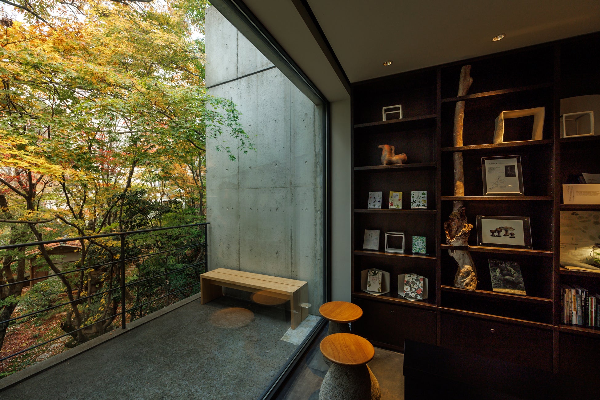 手前には白を基調とした光溢れる空間があり、花梨やアオダモが花や実をつける様子が見られます。奥には黒を基調にした静寂な空間があり書庫が置かれています。アート・建築・デザイン ・工芸・文学書などが集められています。