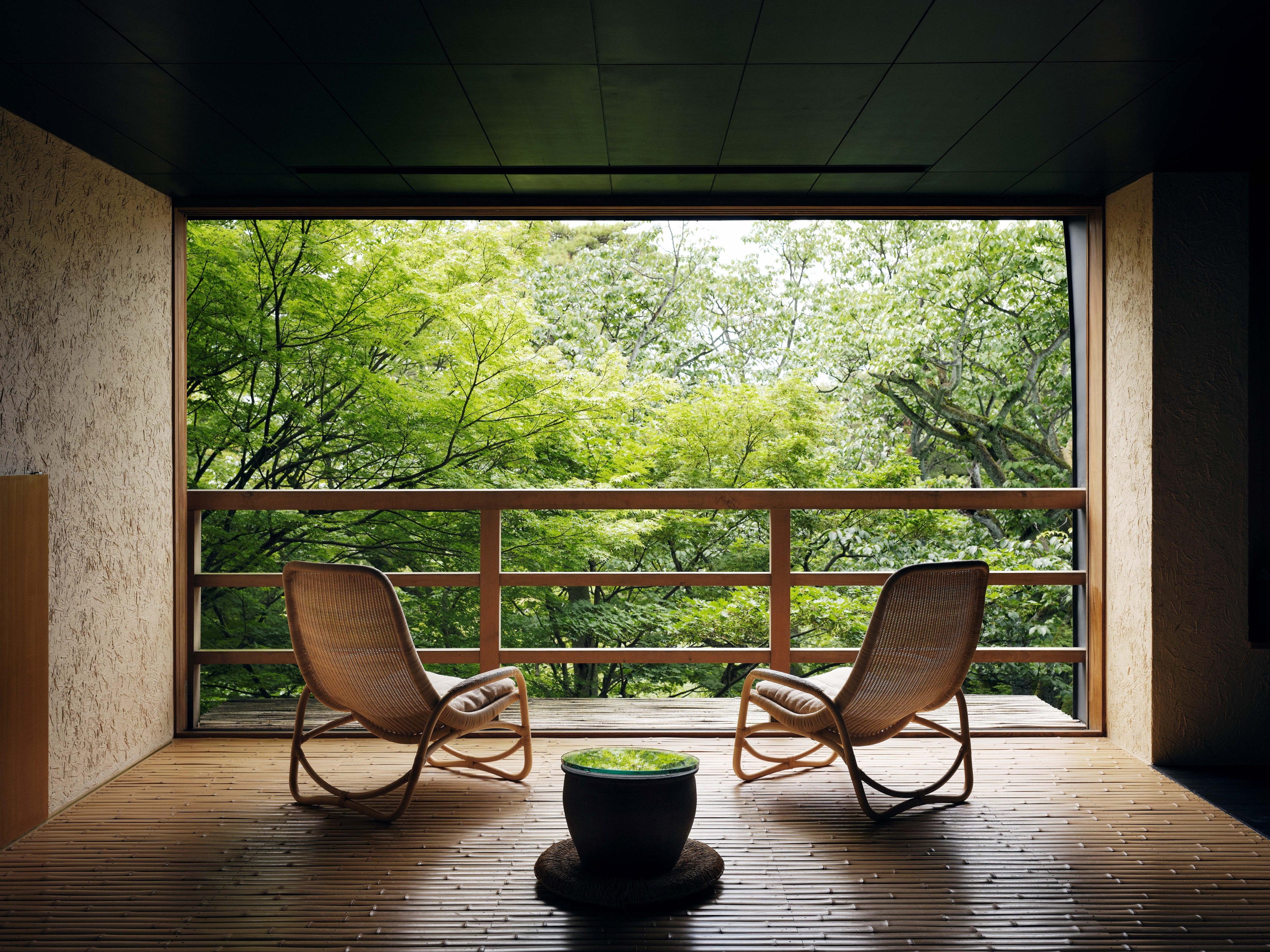 新客室「露天風呂付ジュニアスイート」は月見台(テラス)と露天風呂を備え、山庭の木々が手に触れるほど近く、まるで自然の中にいるようです。自然と共に呼吸する安息の休日をお楽しみください。