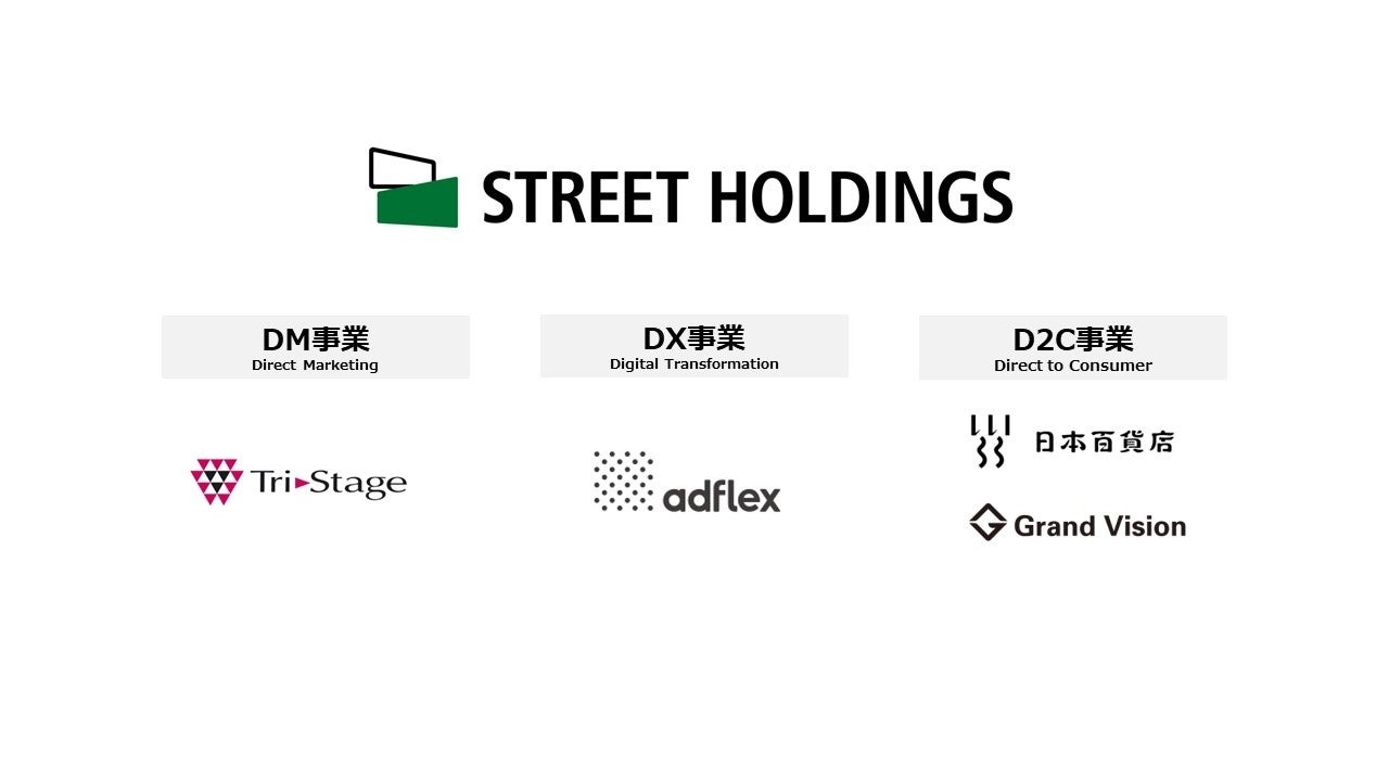 STREET HOLDINGSは、今春よりホールディングス経営体制をスタートし、「だれもが、よりよいものへ、まっすぐつながる世界をつくる。」をパーパスとして、「DM事業」、「DX事業」、「D2C事業」の3事業を中心として新たな事業創造に取り組んでいます。