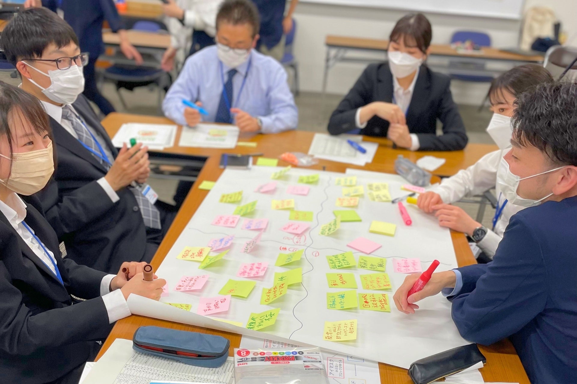 補聴器や人工内耳を装着している聴覚障害者が、起きている間にそれらを外す場面は、お風呂かプールか美容院です。そのため、サービスを受けている間はコミュニケーションが難しくなります。そこで、合理的配慮提供の講義と併せて、当研修を肌感覚で体験していただきました。感覚的な理解を深め、感情を共有し、これからの業務に活かすアイデアを付箋を使いながらディスカッションし、行動宣言に落とし込みました。
