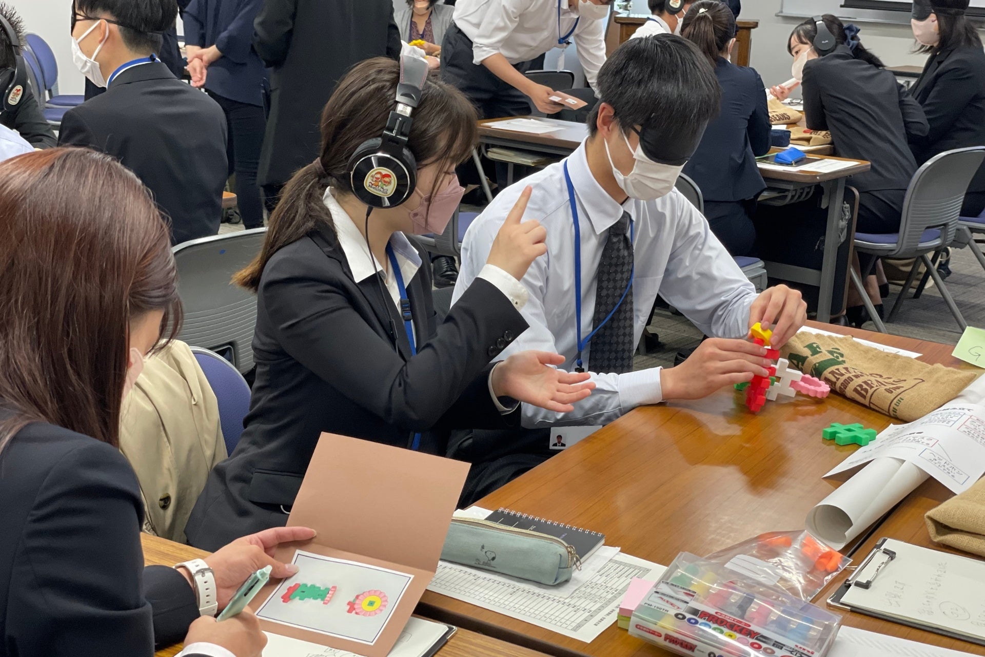 見えない(アイマスク)、聞こえない(ヘッドフォン)、話せないという状況を 3人1組で体験しながら、協力し合ってブロックを組み立てるワークショップを実施。研修を通して、障害の有無に限らず相手の立場で想像する大切さを学べたと好評をいただきました。