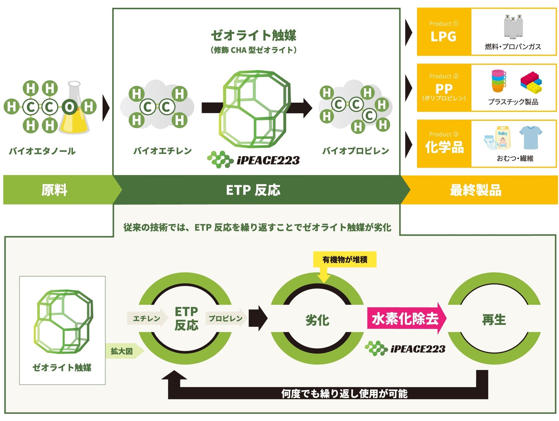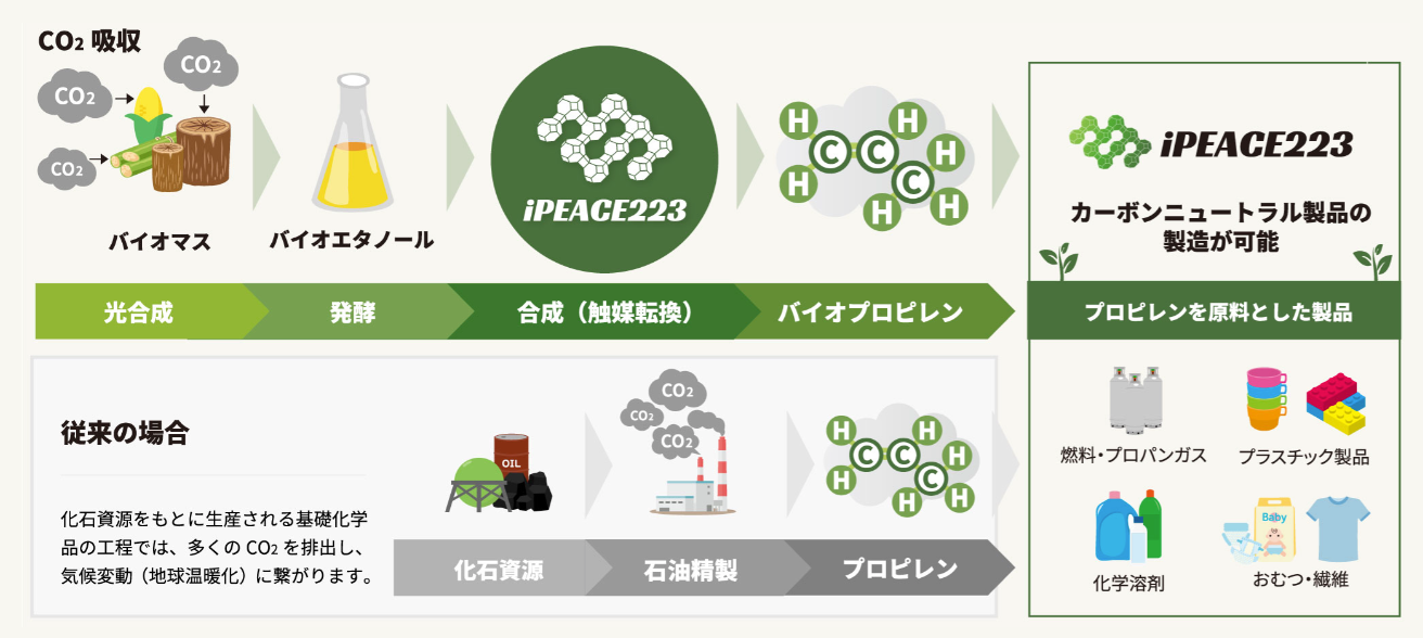 グリーンプロピレン製造技術の確立に向けて、三菱ケミカル株式会社が開発した、エチレンからプロピレン製造が可能なゼオライト触媒技術を実用化するため、2023年8月にiPEACE223を設立しました。iPEACE223は、バイオエタノールを原料に、エチレンからプロピレンを製造するための触媒プロセスの開発、製造プラント設計、触媒開発を行います。