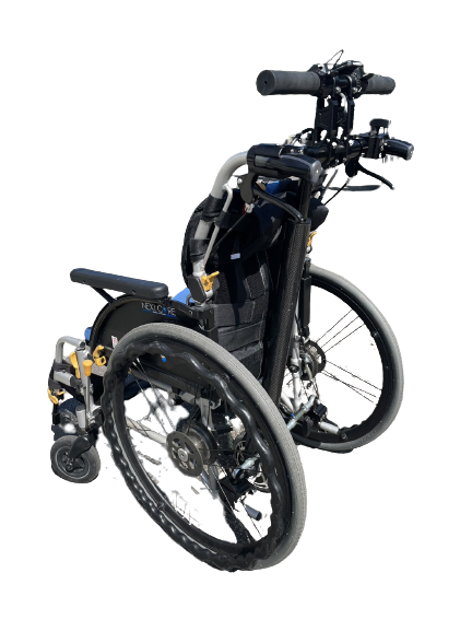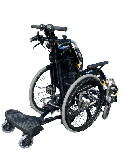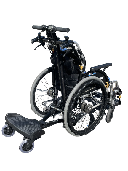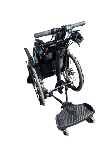 手動式車椅子を楽に押せるeモビリティが初登場!押す人もタイヤ付きボードに乗って一緒に移動で快適