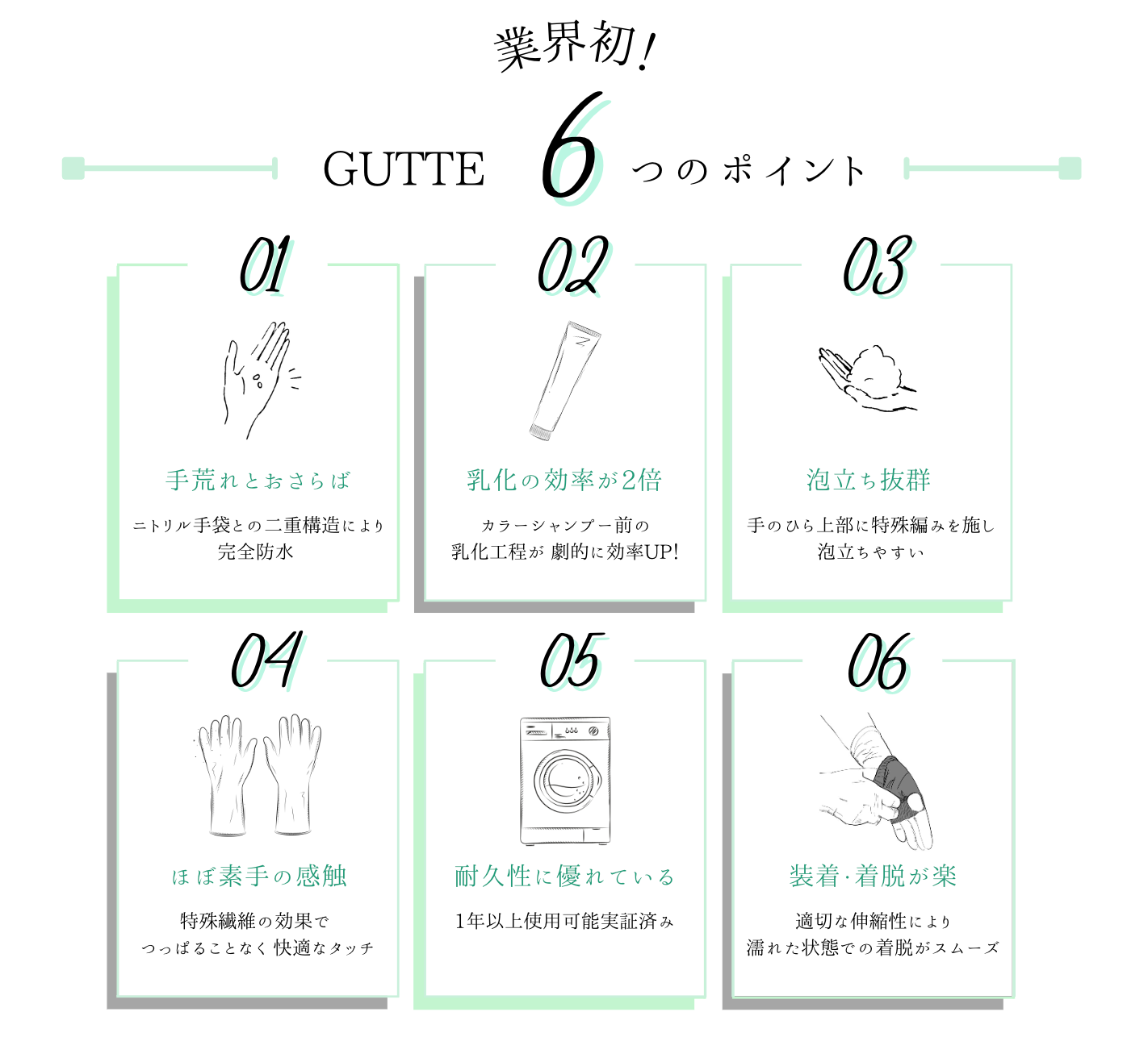 美容師の数もどんどん少なくなっていくなか、新入生は希少な人材です。その中で離職する原因として多いのが手荒れです。過去にさかのぼっても「手荒が原因で美容師をあきらめたんですよ…」という声をよく聞きます。昨今では手荒れを保護しなければ労災の問題としても取り上げられるほどです。現在の美容業界では相変わらず素手の仕事が主で、入店して最初にトレーニングするシャンプーも素手で教えるサロンが大半だと思います。最初にトレーニングする段階からGUTTEを着用して習得すれば、手荒れのリスクは回避できます。
