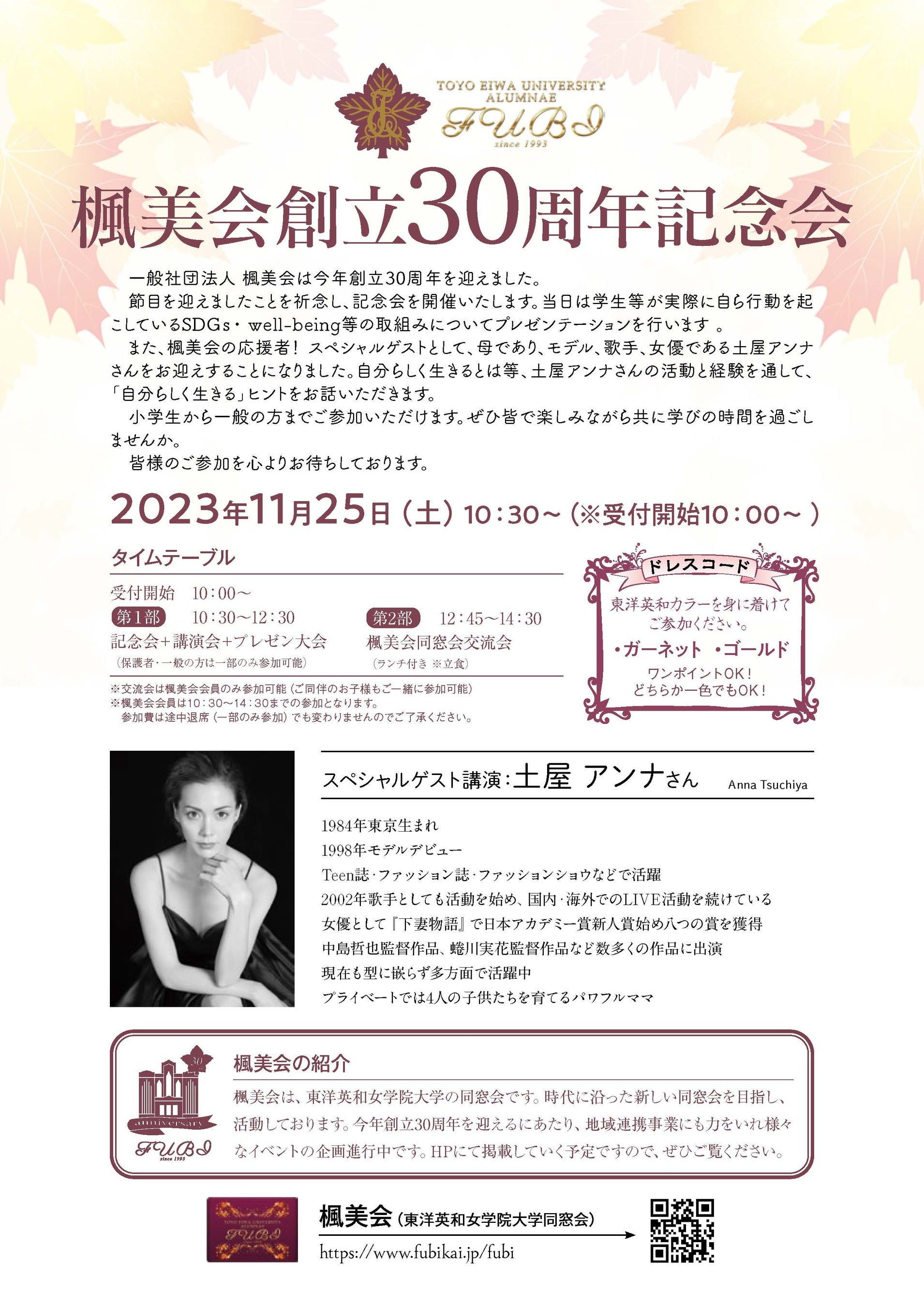 2023年11月25日(土) 会場:経団連ホールにて、人生100年時代に沿った新しい同窓会組織を目指す一般社団法人 楓美会(東洋英和女学院大学 同窓会)は創立30周年記念会を開催します。