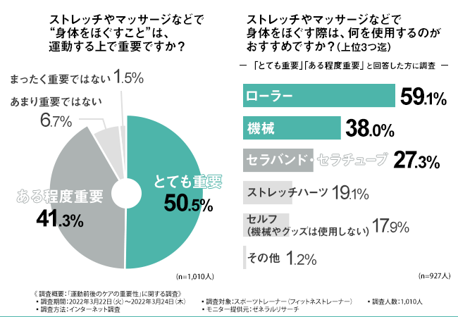 以下調査によると、スポーツトレーナー(フィットネストレーナー)の、実に9割以上の方が運動する上で身体をほぐすことは重要であると考えています。