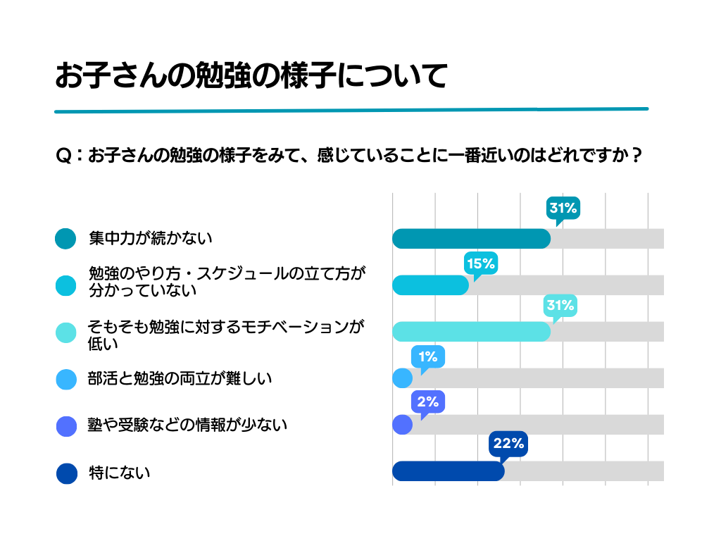 お子さんの勉強の様子をみて感じていることとして「集中力が続かない」「そもそも勉強に対するモチベーションが低い」が31%と同率1位。