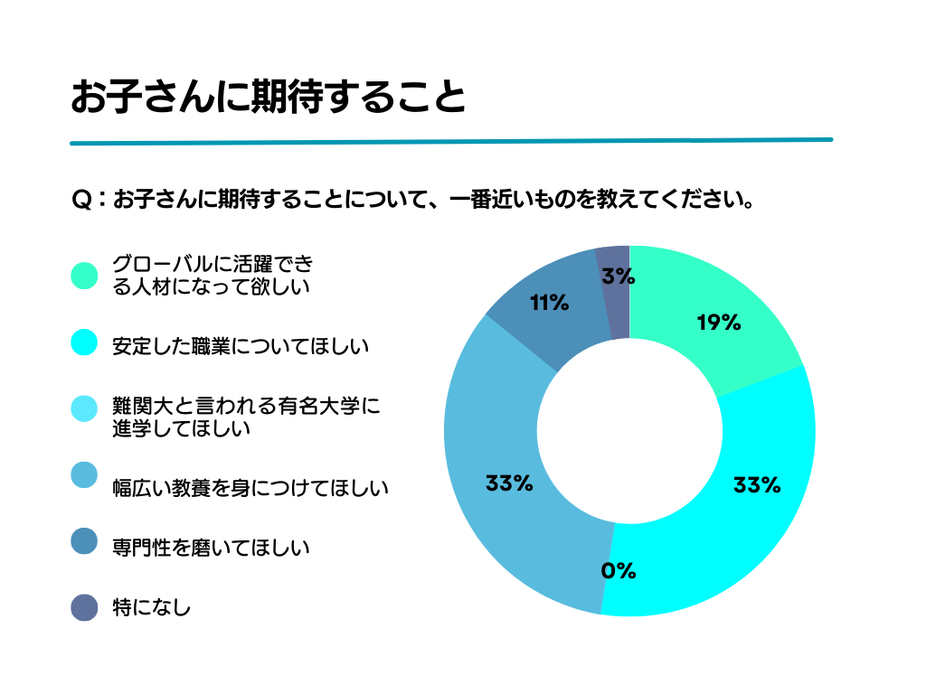 ◆お子さんに期待することについて5人に1人の保護者が「グローバルに活躍できる人材になってほしい」と回答。その他「安定した企業についてほしい」「幅広い教養を身につけてほしい」などが回答多数となった。その理由として、先行き不透明な社会への不安が見受けられた。