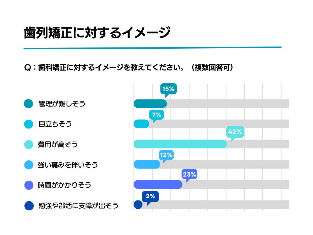 歯科矯正に対するイメージとして全体の42%が「費用が高そう」と回答。次いで「時間がかかりそう」23%、「管理が難しそう」15%となった。