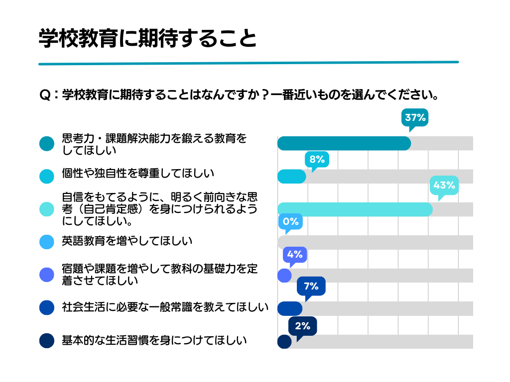 ◆全体の43%の保護者が学校教育に期待することとして「自信を持てるように、明るく前向きな思考(自己肯定感)を身につけられるようにしてほしい」と回答。次いで「思考力・課題解決能力を鍛える教育をしてほしい」が37%となった。