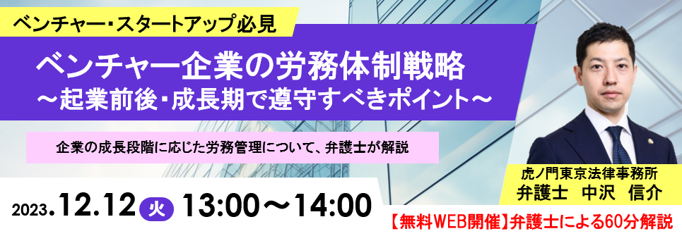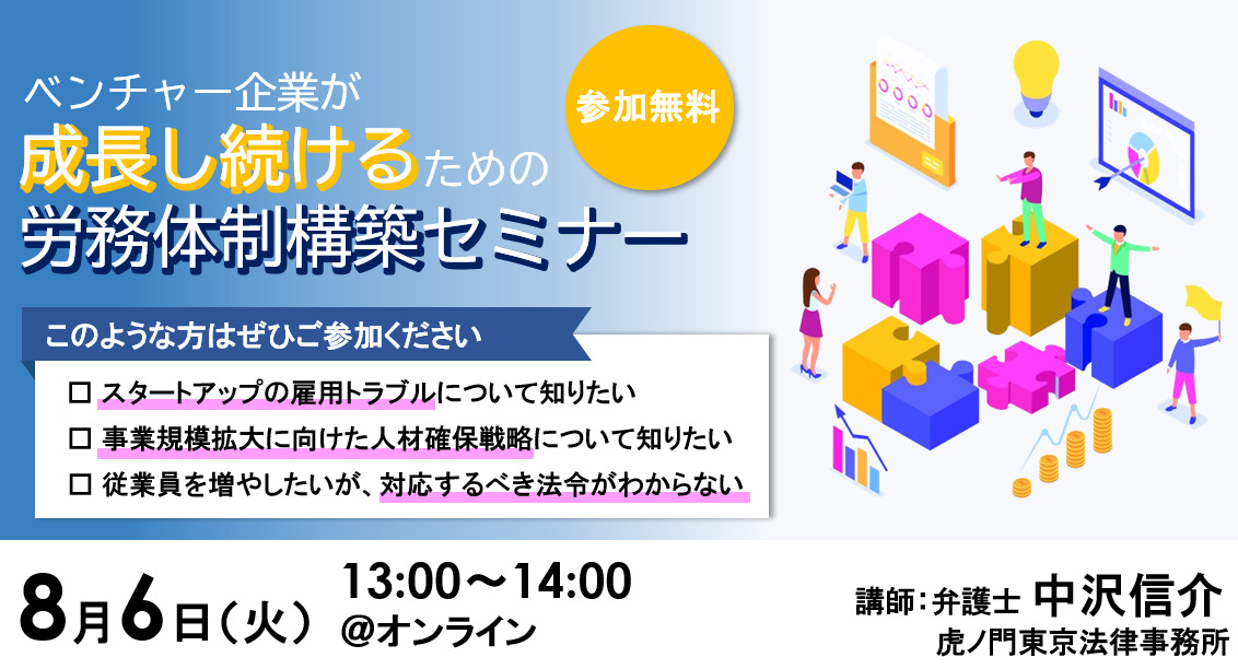 虎ノ門東京法律事務所弁護士 中沢信介は、8月6日(火)13時より、エンジェル・シード期のスタートアップ企業様・経営者の方向けにセミナーを開催いたします。