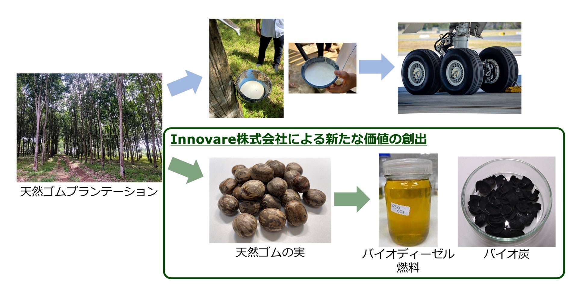 Innovareでは、これまで未利用資源として放置されていた天然ゴムの実を原料として、世界で初めて天然ゴムの実からバイオ燃料、バイオメタンガス、およびバイオ炭を生成するアップサイクルの実用化を行っています。