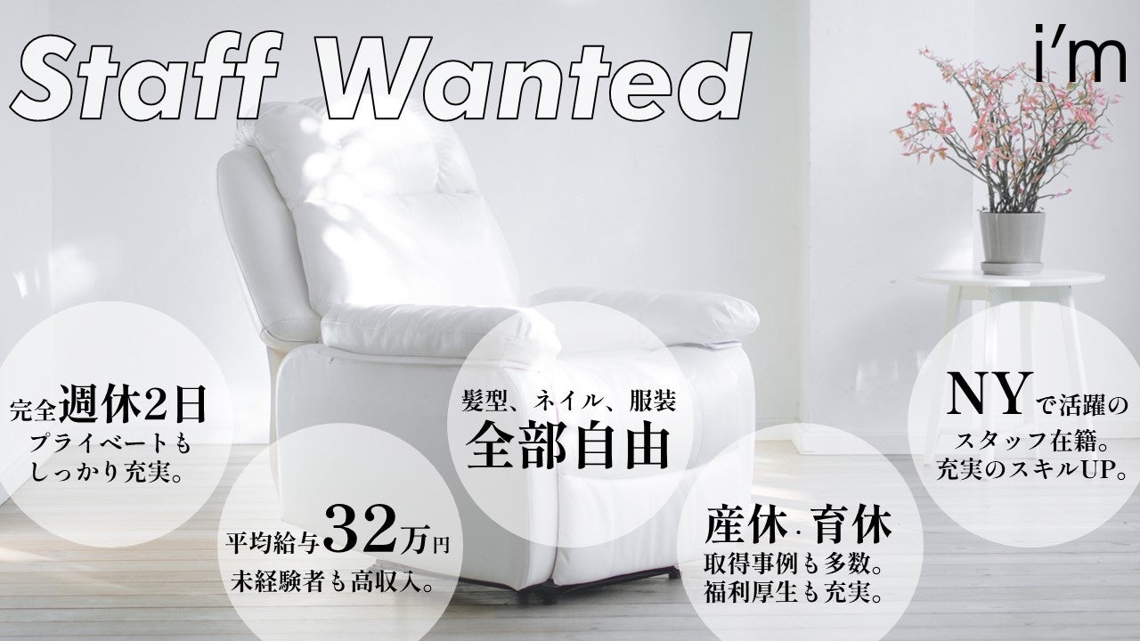アイブロウサロン i'm グループでは、全店舗にて積極採用中です。美容施術は人を介するサービスであるため、私たち i'm グループでは従業員一人一人の職場環境の満足度や日々の生活における幸福度を重視しています。「STAFF FIRST」を掲げ、育成・研修の運用を充実させるとともに、スキル向上に向けても研修・講座を提供しています。その結果もあり、OPEN当初は2名のスタッフから始まり、今では150名を超えるスタッフが在籍しています。少しでもご興味がある方は、公式HPもしくは公式instagramのDMからお問い合わせくださいませ。