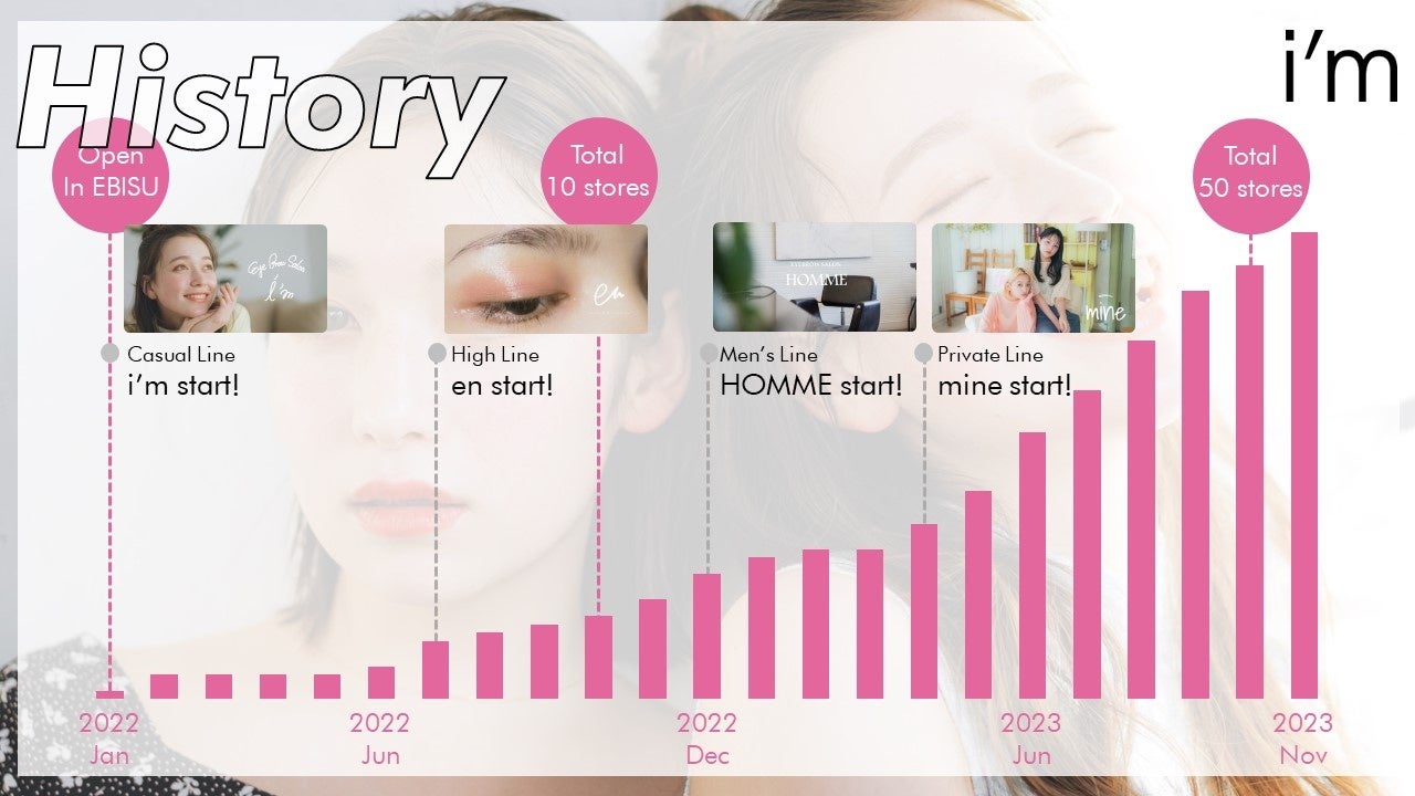 アイブロウサロン i'm は、「FIND OUT YOUR EYEBROW~あなただけのアイブロウを見つけましょう。~」をコンセプトに掲げ、2022年1月に東京恵比寿にて1号店をOPENいたしました。その後1年半をかけて全国都市へ展開し1年半で直営店50店舗(フランチャイズ含め56店舗)まで拡大いたしました。i'm グループではあらゆるお客様の理想の眉毛を叶えるべく、アイブロウリストの技術力向上にも注力しています。プロフェッショナルな講師・研修を設けることで、所属アイブロウリストの規模を拡大させつつも、技術向上と安定した事業運営基盤を築いてきました。
