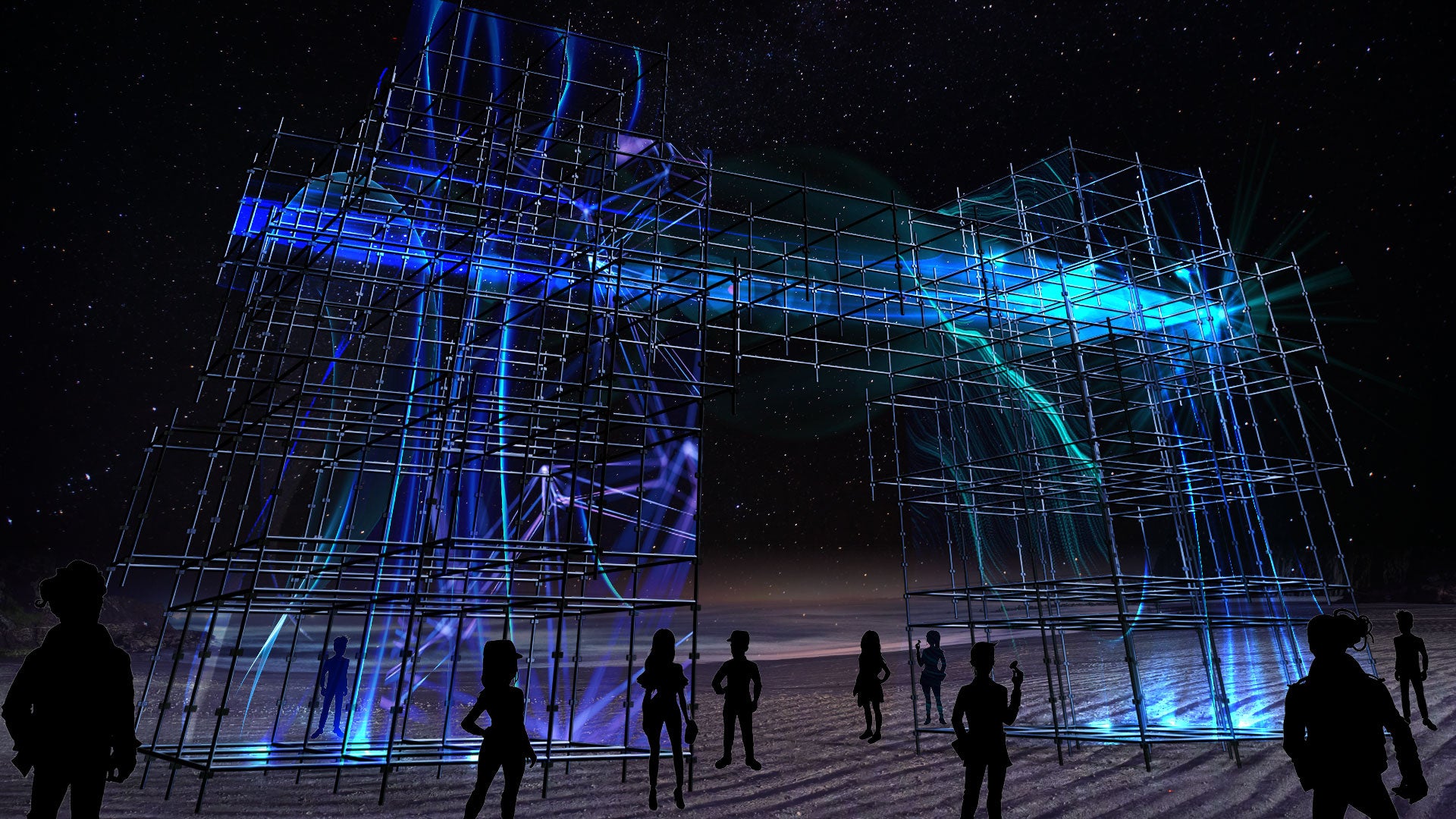 巨大な足場造形にレーザーなどを使った不思議な光の演出を 施した門が出現!