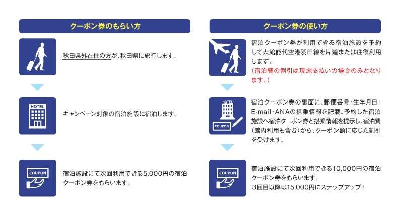 秋田県外在住の方が、キャンペーン期間内に対象宿泊施設に宿泊した際、次回来訪時に大館能代空港東京羽田線を片道または往復利用し、かつ県内宿泊施設に宿泊した場合に使用できる宿泊等の割引クーポンを発行します。