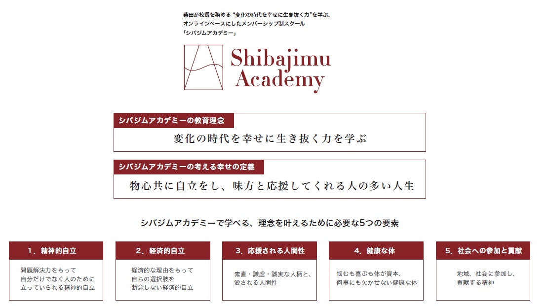 事業構想が始まった3年前はコロナなどの影響もあり、ライフスタイルや働き方もますます多様化し、柴田がこれまでたくさんの学びや気づきを得た現場学習の機会は極端に少なくなりました。また、直接的なコミュニケーションを通じての成長の機会も減り、社会環境が大きく変わろうとしている変化の時代を迎えました。この変化の時代をその人らしく生き生きと、仕事も個人の生活も充実させられる人が増えるよう、2021年11月、柴田が校長を務める「変化の時代を幸せに生き抜く力を持つ人の育成」を目指したオンラインスクール「Shibajimu Academy(以下、シバジムアカデミー)」を開校しました。開校から約1年半、1,000名を超える方に受講いただき、3期目を迎えるにあたり、シバジムアカデミーの理念をもっと多くの方に届けたい。人生100年時代を生き抜く力を一人でも多くの人に身に付けていただき、“物心共に自立をし、味方と応援してくれる人の多い人生” を歩んでいただくためのお手伝いが出来たらと思い、この度、新たなサービスとしてリニューアルすることになりました。