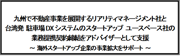 九州を中心に不動産事業を展開するリアリティマネージメント株式会社(福岡市中央区、代表取締役社長 早川 和利、以下「リアリティ社」)は、次世代型駐車場シェアリングサービスを展開する台湾のスタートアップ企業Uspace Tech Co., Ltd.(台湾台北市、總經理 宋 捷仁、以下「Uspace」)の日本子会社 株式会社ユースペース(東京都千代田区、代表取締役 宋 捷仁)と業務提携契約を締結いたしました。