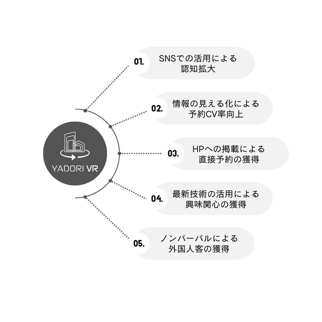 360°見ることのできる映像を宿泊施設のHPやSNSで公開することにより、下記のような「消費者により選ばれるための仕組みづくり」をサポートします。
